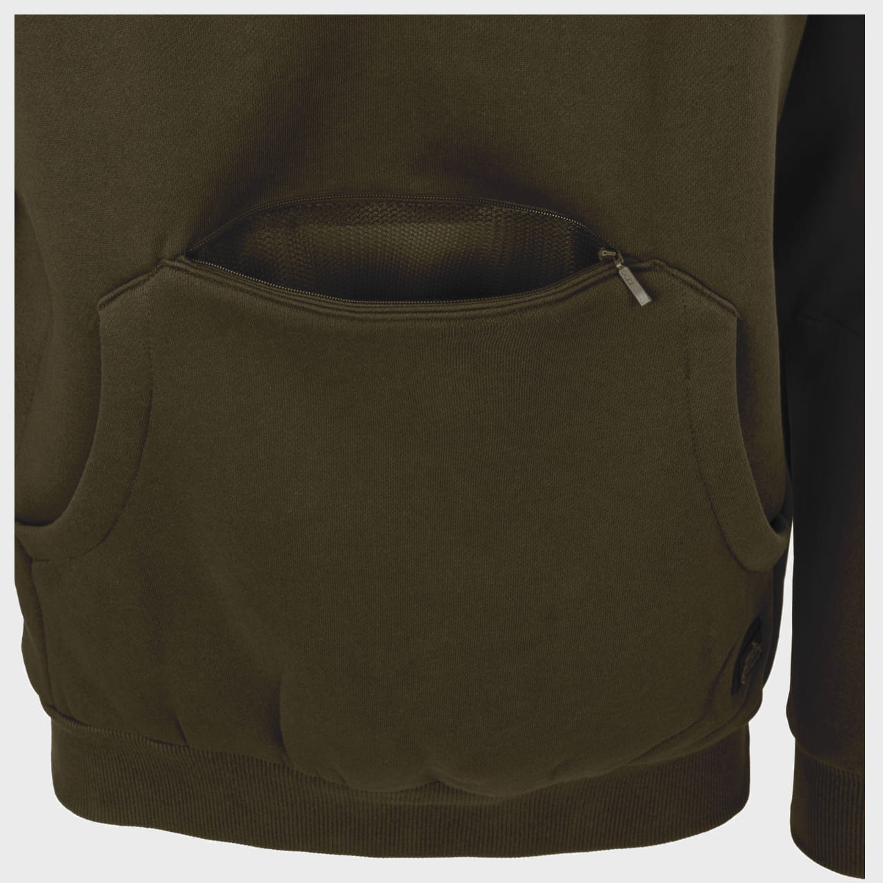 - Ukryta kieszeń zapinana na zamek nad kieszenią kangurką