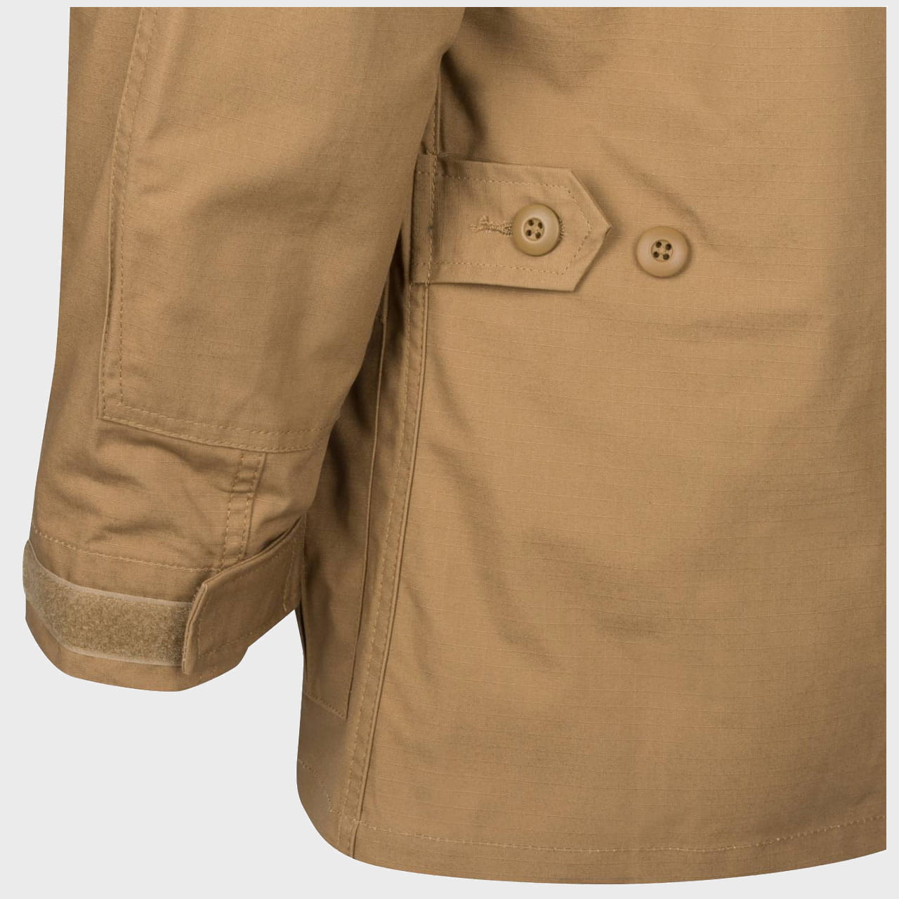 Zapinana na guziki ukryte są w listwie, by o nic nie zaczepiały podczas użytkowania. Posiada także wzmocnienia na łokciach z dodatkowej warstwy materiału.