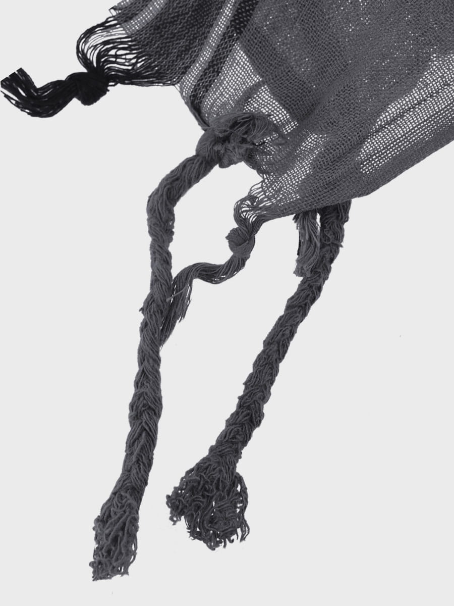 Brzegi chusty są zakończone supełkowanymi frędzlami, które zabezpieczają materiał przed pruciem, a dłuższe frędzle na rogach ułatwiają szybkie odnalezienie rogu chusty.
