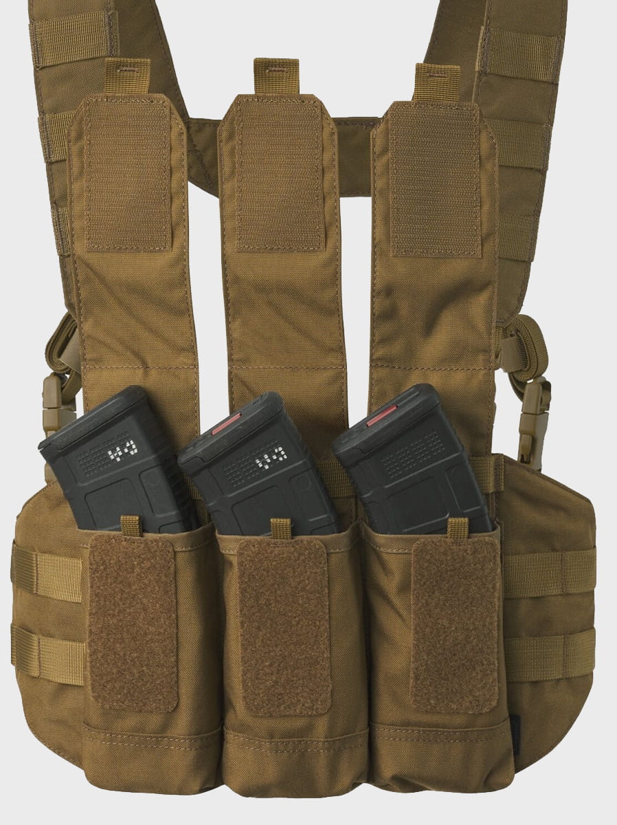 Kamizelka Chicom Chest Rig od polskiej marki Helikon. Chicom Chest Rig ma charakterystyczną konstrukcję ze ściętymi bokami i trzy kieszenie zamykane klapkami na rzep. W zależności od potrzeb klapki można odczepić i wymienić na pullery dołączone do zestawu.