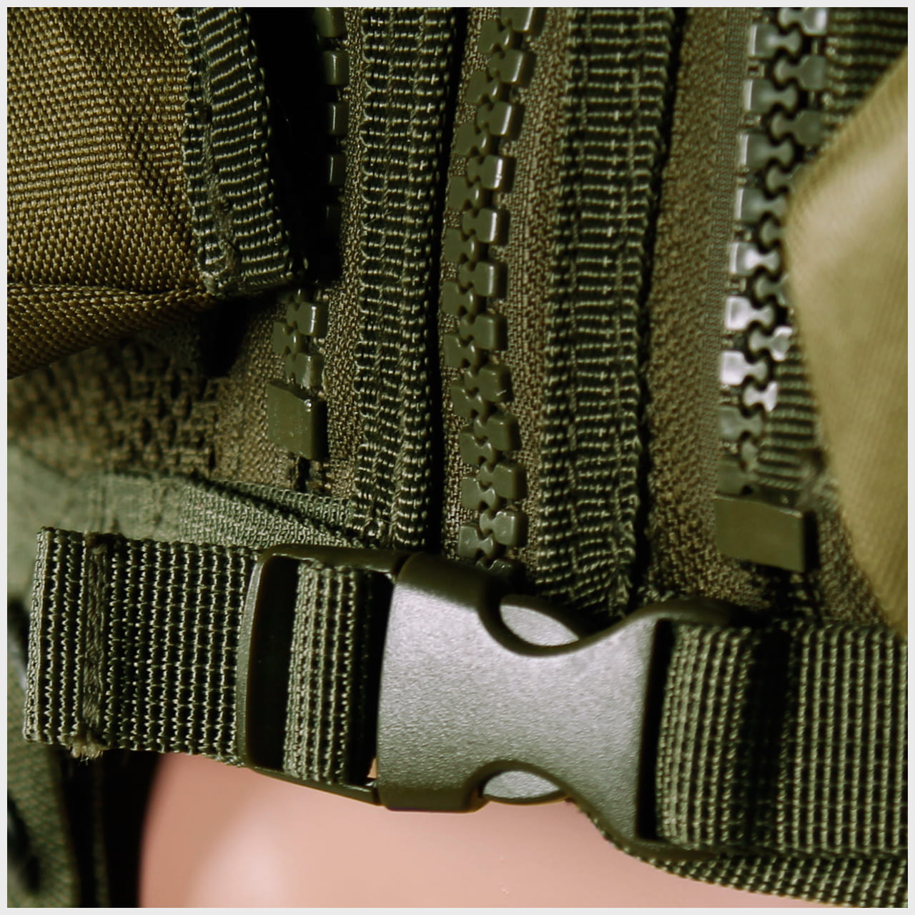 Zapinany na solidny zamek, a trzy dodatkowe klamry dają możliwość awaryjnego zapięcia na kamizelce kuloodpornej bez konieczności regulacji.