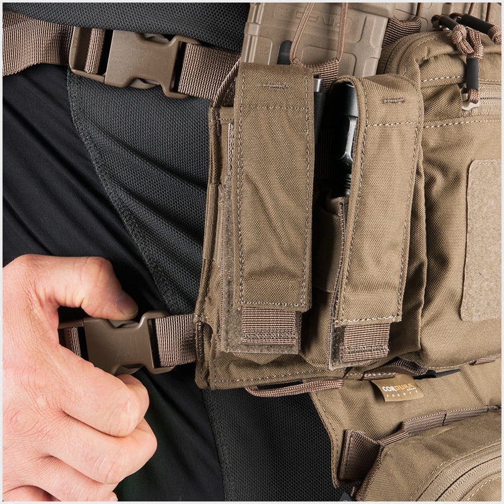 Kamizelka została wyposażona w wypinany pas biodrowy z możliwością regulacji. Uniwersalne, odpinane oraz regulowane szelki w układzie H, do których dzięki poziomym taśmom montażowym można doczepić dodatkowe oporządzenie taktyczne.