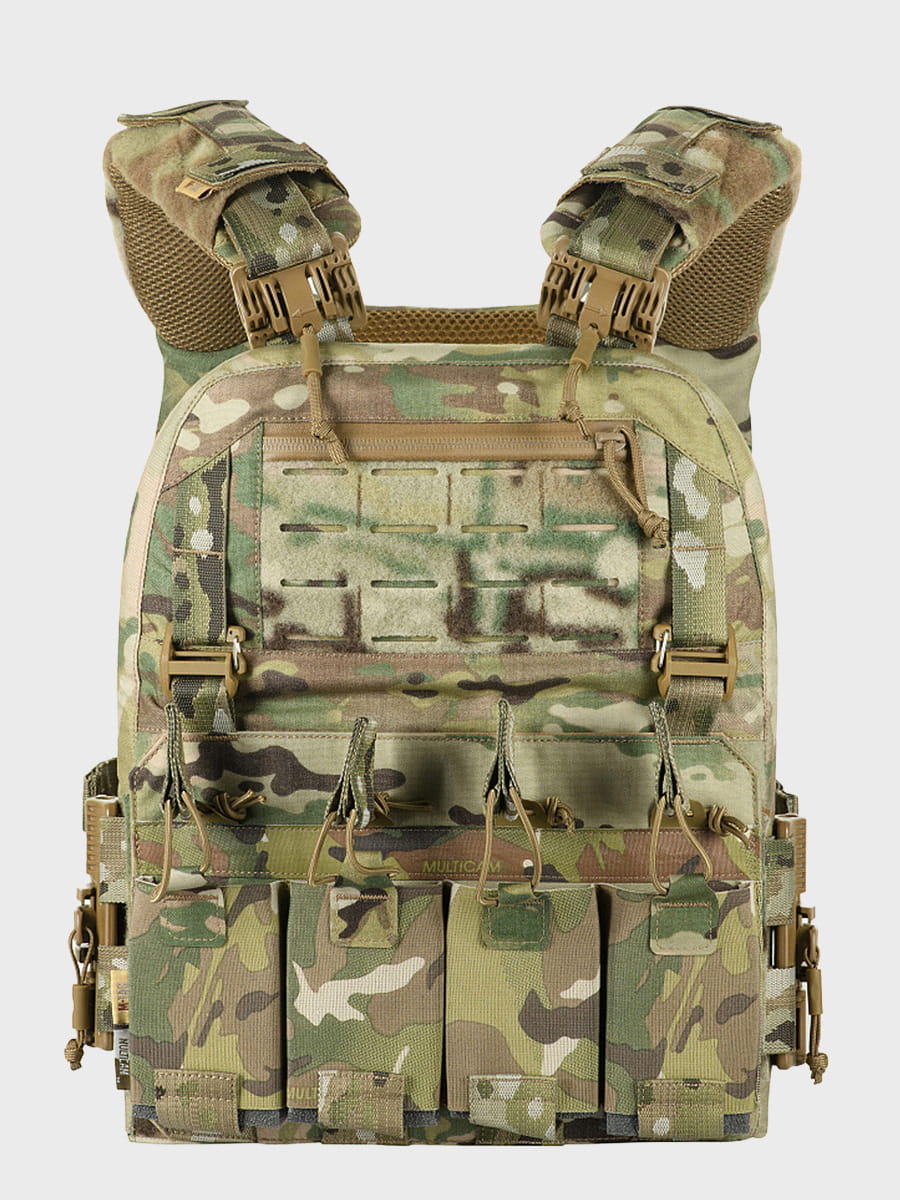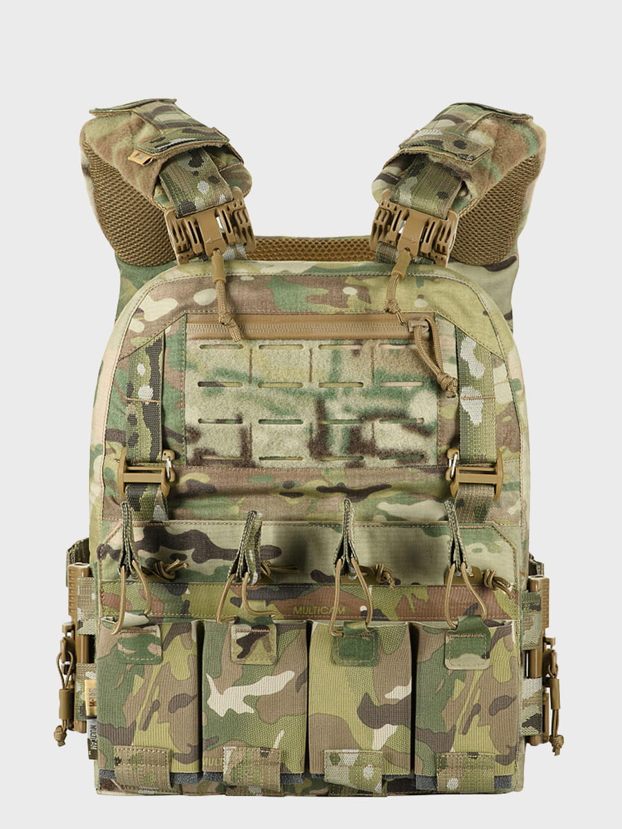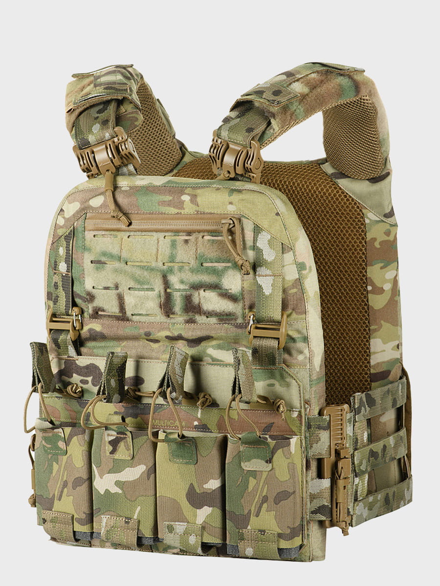 Kamizelka typu Plate carrier została wykonana z bardzo mocnego materiału odpornego na ścieranie i duże obciążenia Cordury 500D. Po wewnętrznej stronie kamizelki znajdują się wstawki z siatki 3D, które zapewniają amortyzację i cyrkulację powietrza.