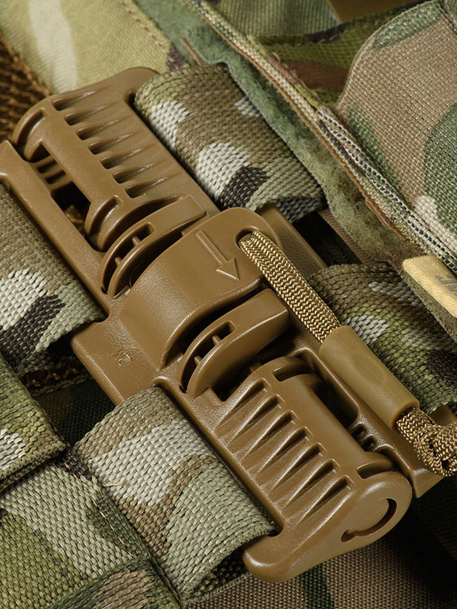 - Odpinane zapięcia z okuć 2M ROC Buckle znajdujące się w części naramiennej kamizelki typu plate carrie
