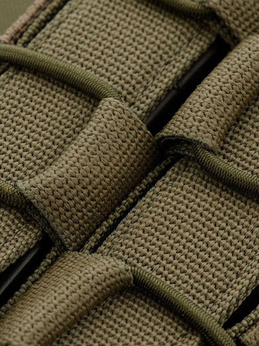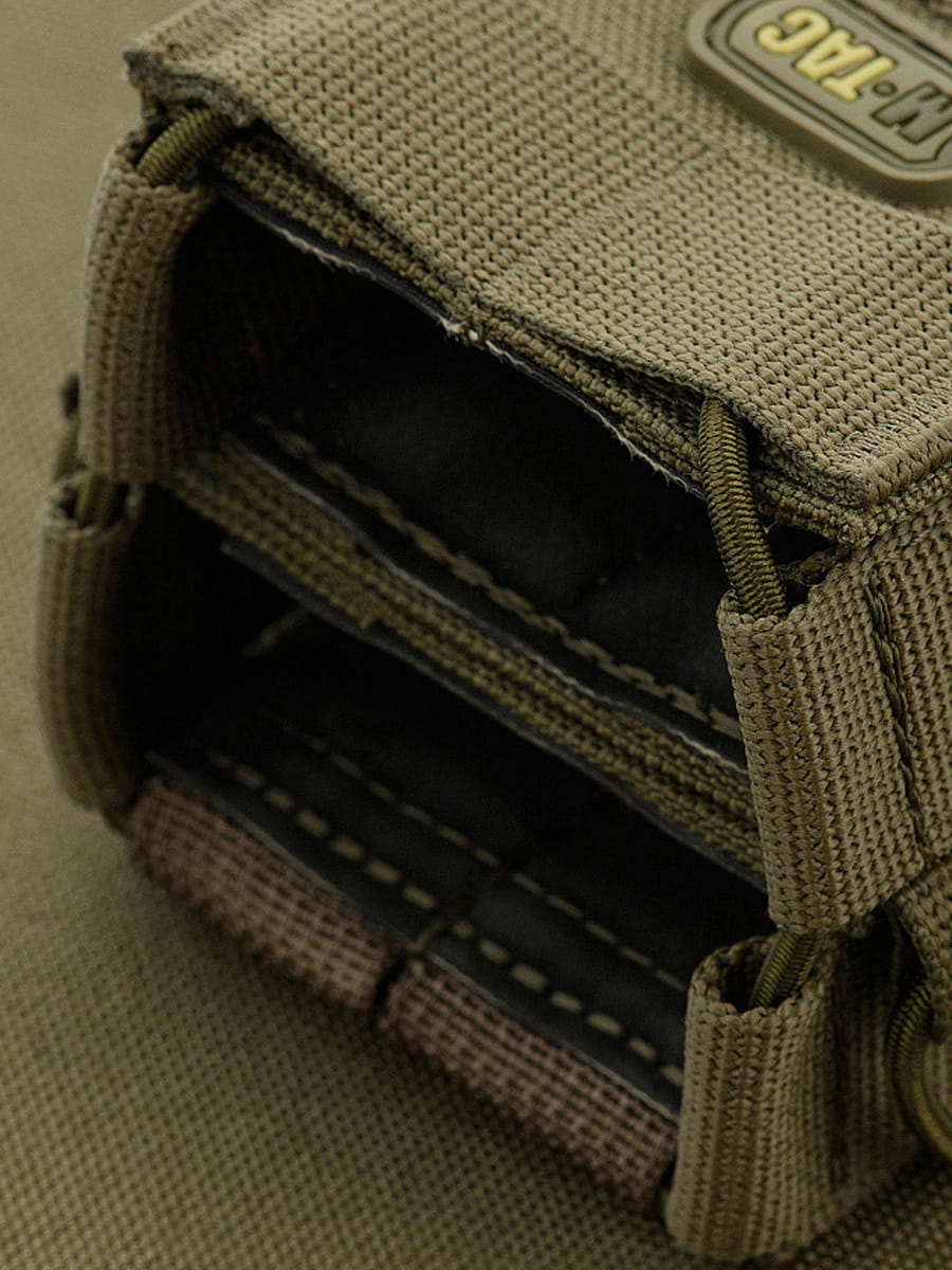 Ma unikalną konstrukcję - dodano specjalną gumowaną, antypoślizgową uszczelkę winylową, która bezpiecznie trzyma magazynki i nie wypadają one w żadnych okolicznościach, nawet podczas skoków ze spadochronem i w pozycji odwróconej. Ale gdy tylko spróbujesz wyjąć magazynek, natychmiast znajdzie się on w twojej dłoni, ponieważ powierzchnia robocza uchwytu pozostaje dla ciebie dostępna, gdy magazynki znajdują się w torbie. Znacznie przyspiesza to przeładowanie i sprawia, że manipulacje związane z wymianą magazynków są bardziej wydajne i szybsze.