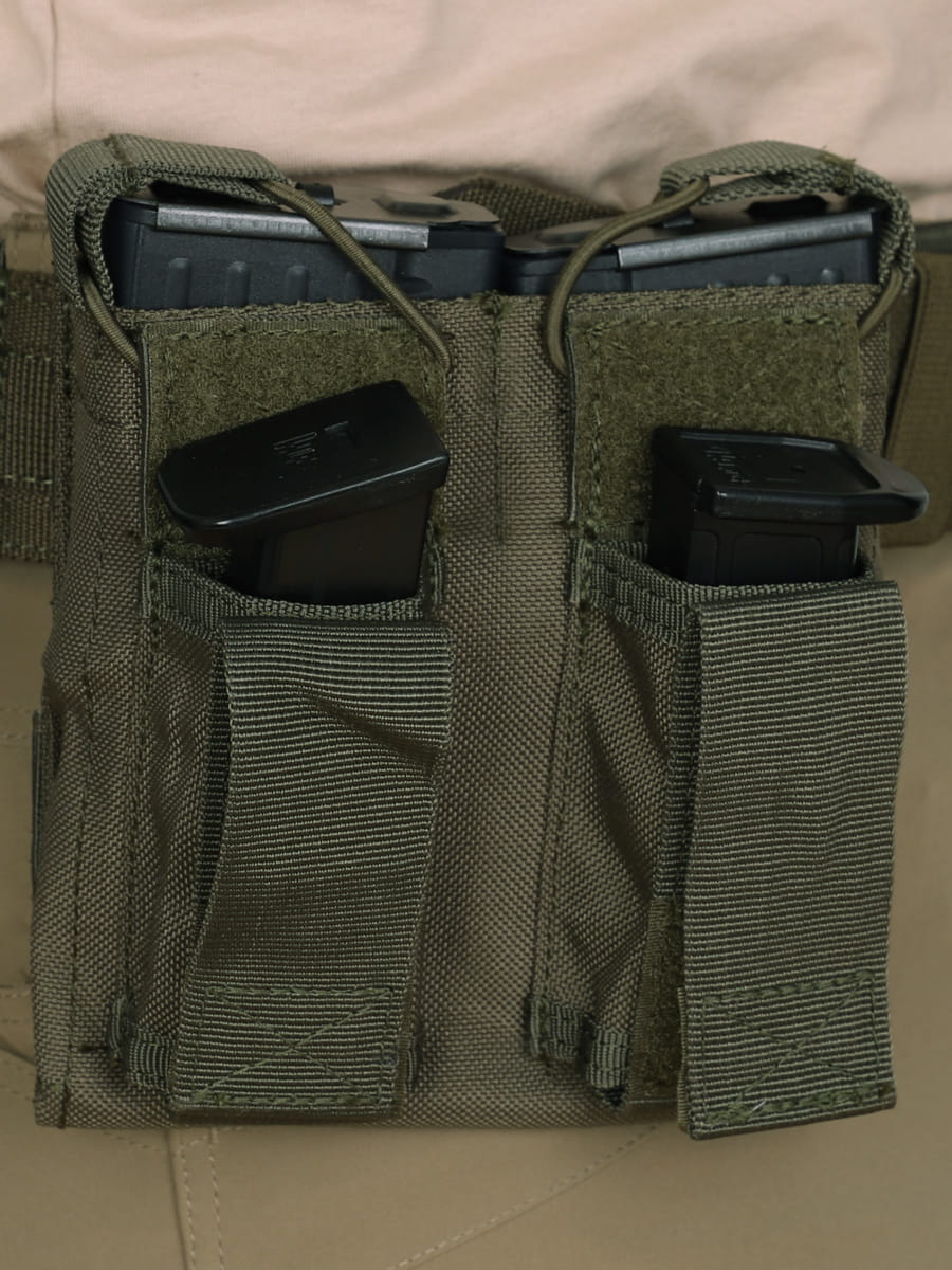 Zastosowanie elastycznej linki Bungee (Shock Cord) do zabezpieczenia magazynków karabinowych oraz taśmy z rzepem do zabezpieczenia magazynków pistoletowych zapewnia pewne trzymanie magazynków podczas ruchu, a jednocześnie umożliwia szybki dostęp do nich w razie potrzeby.