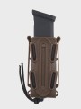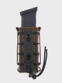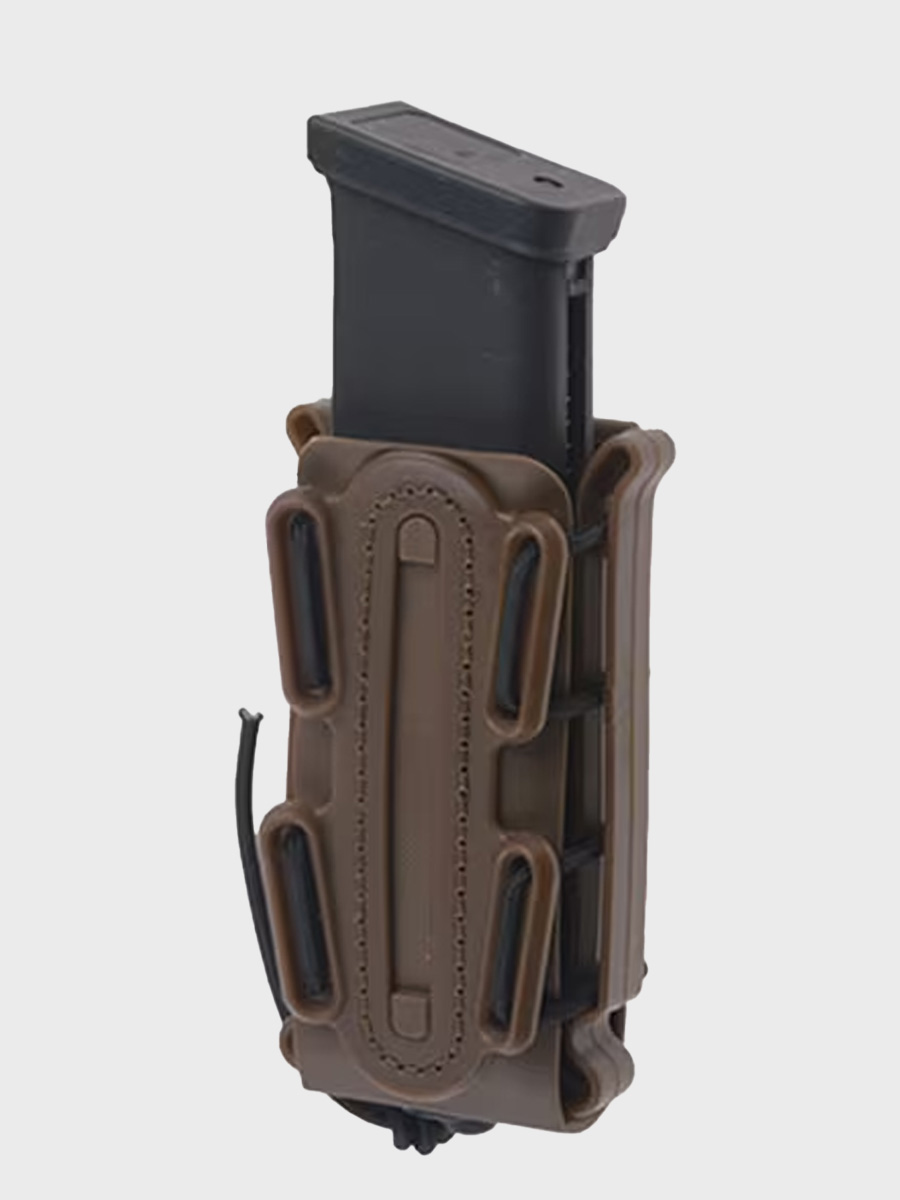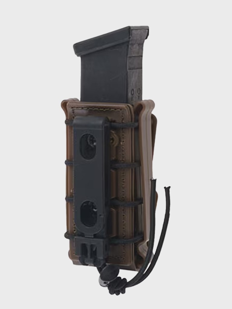 Ładownica typu fast na jeden magazynek pistoletowy 9 mm od marki FMA. Wykonana z elastycznego, a jednocześnie wytrzymałego tworzywa sztucznego i gumy. Wyposażona w regulowaną linkę elastyczną, zapewnia bezpieczne trzymanie magazynka i szybki dostęp. Kompatybilna z systemem MOLLE i pasami o szerokości do 45 mm. Kolor: Dark Earth.