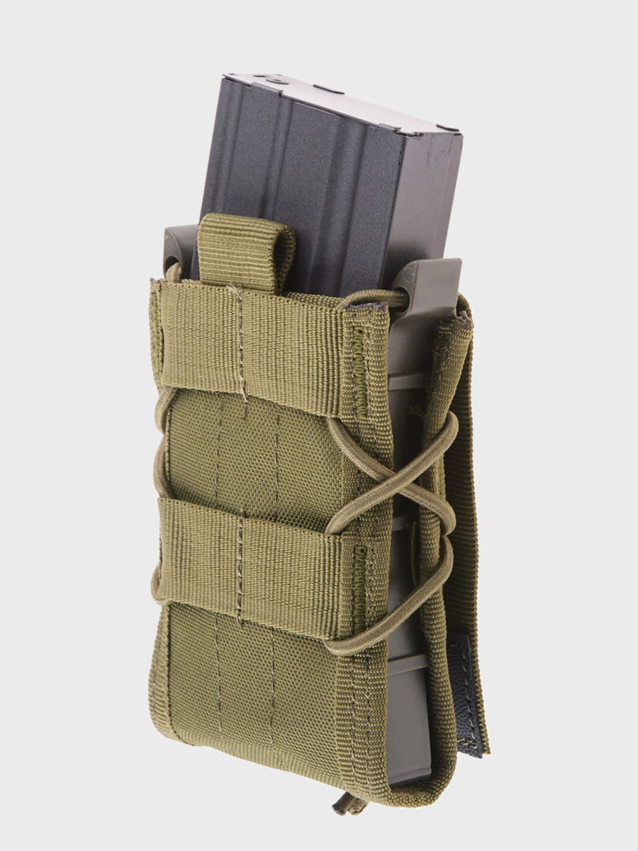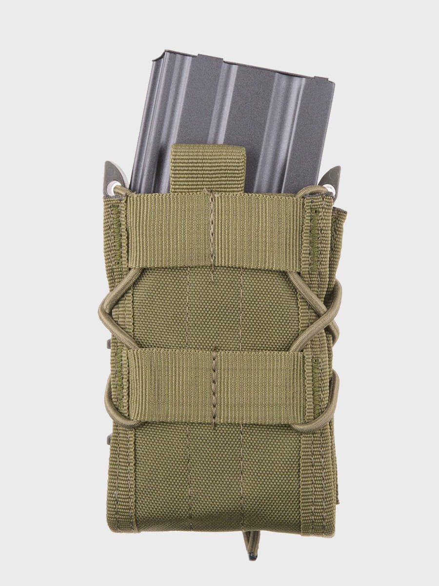 Magazynek utrzymywany jest w kieszeni dzięki elastycznej lince, co przy braku klapy umożliwia jego szybkie dobycie.