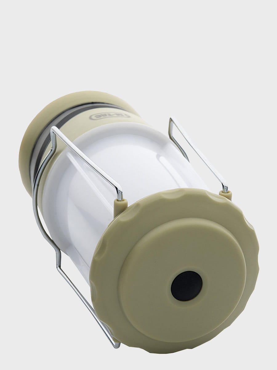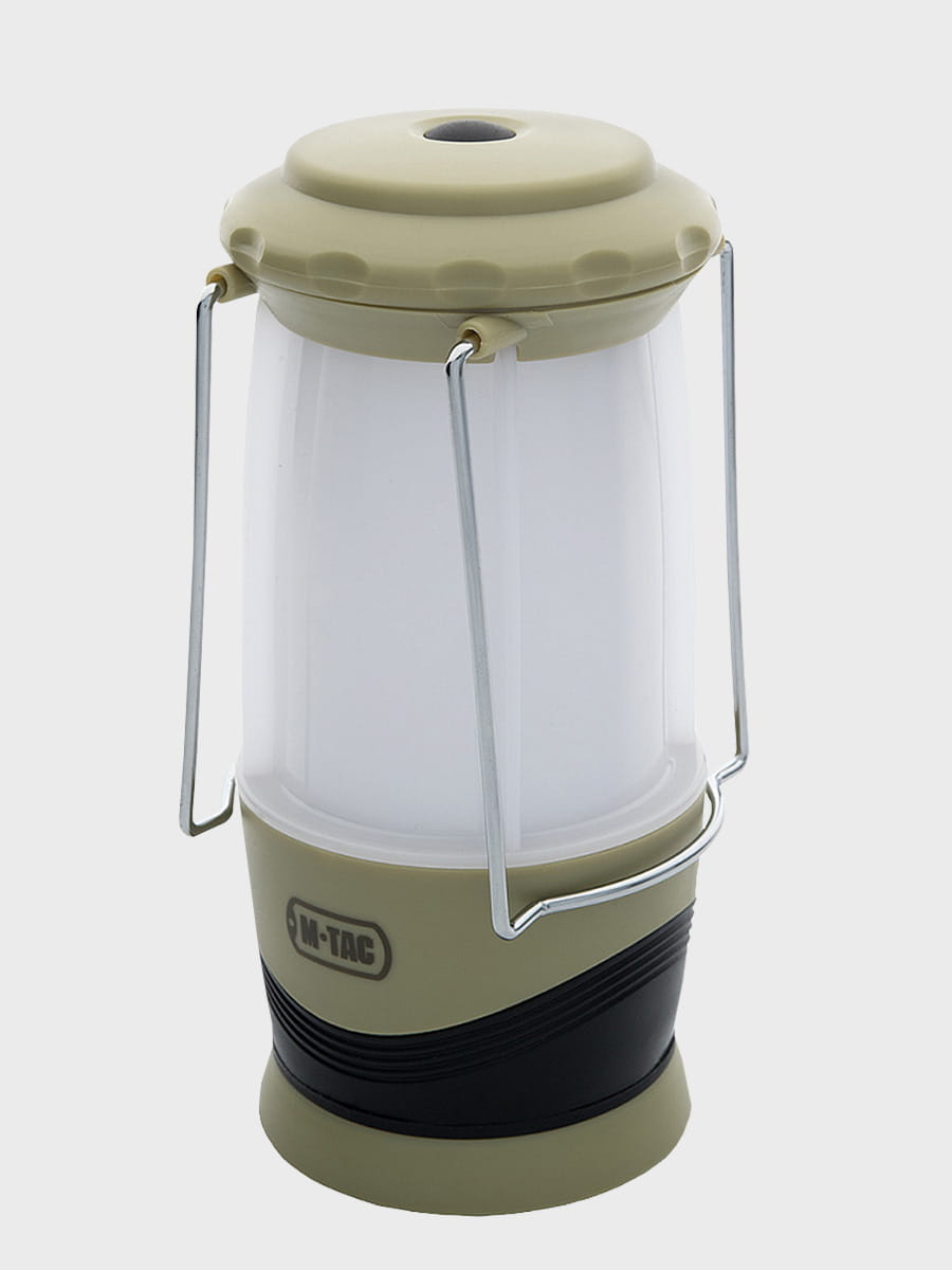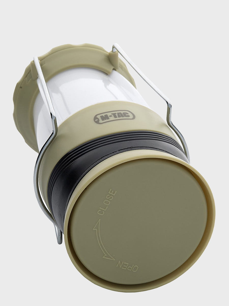 Latarka jest zasilana 4 bateriami (brak w zestawie). Na górze znajdują się dwa metalowe uchwyty, które pozwalają zawiesić latarkę i używać jej jako stacjonarnego źródła światła.