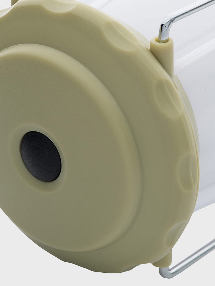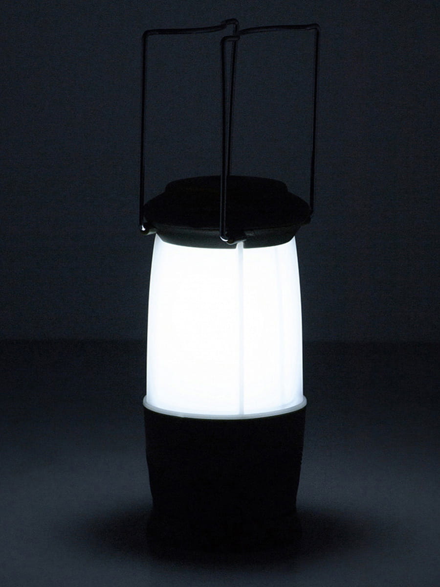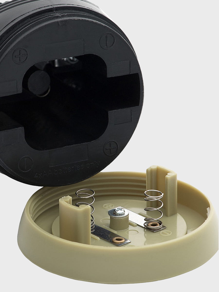 Latarka jest zasilana 4 bateriami (brak w zestawie). Na górze znajdują się dwa metalowe uchwyty, które pozwalają zawiesić latarkę i używać jej jako stacjonarnego źródła światła.