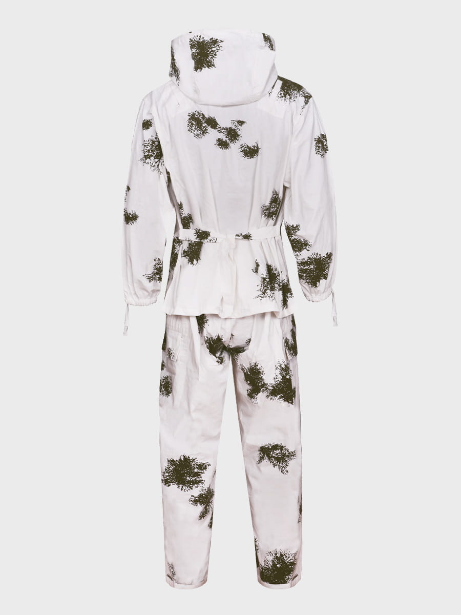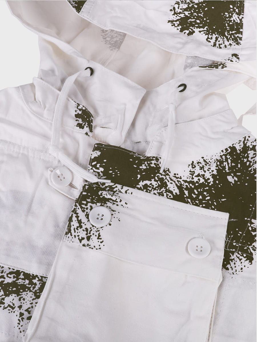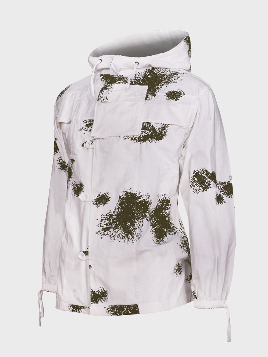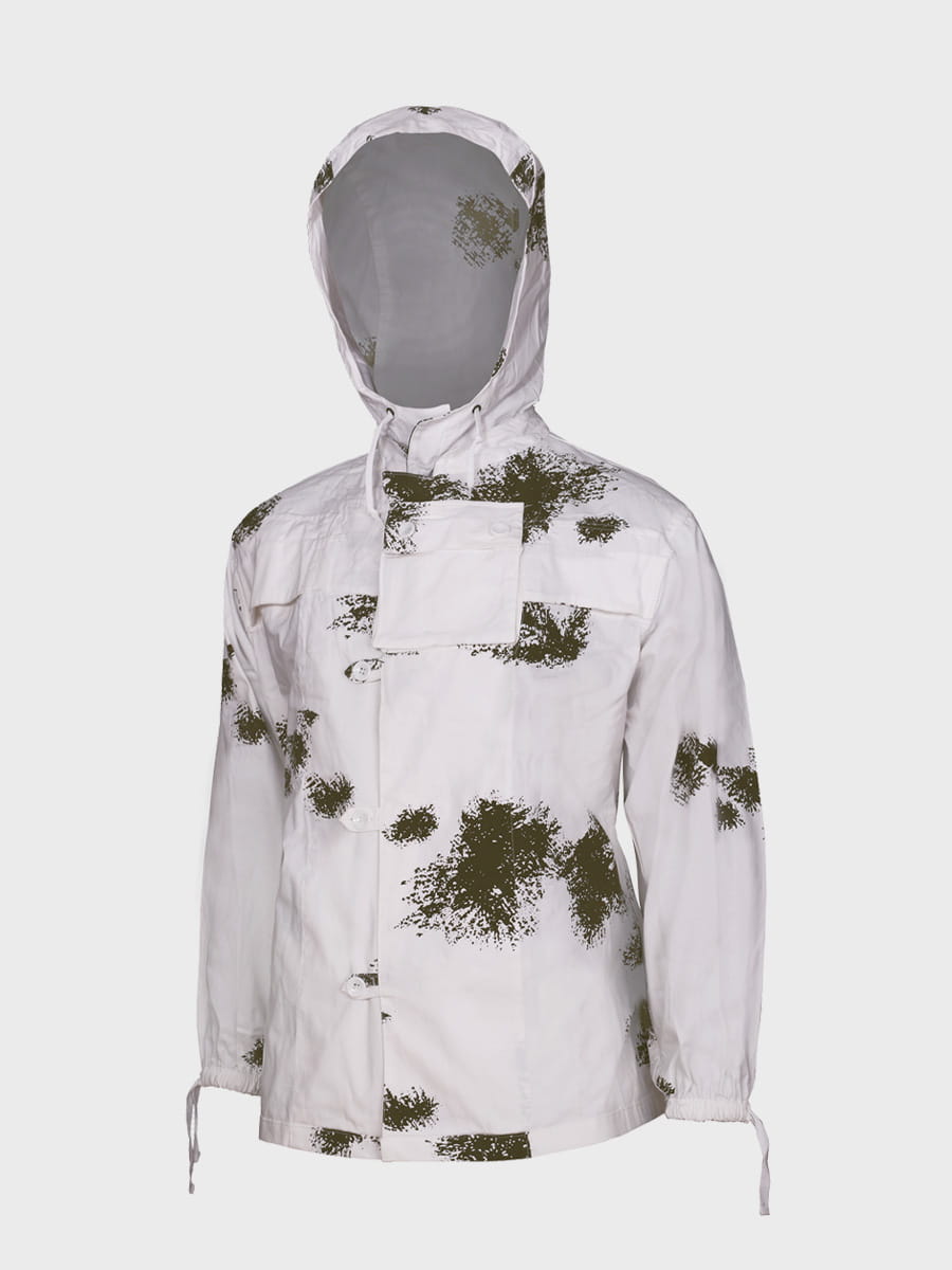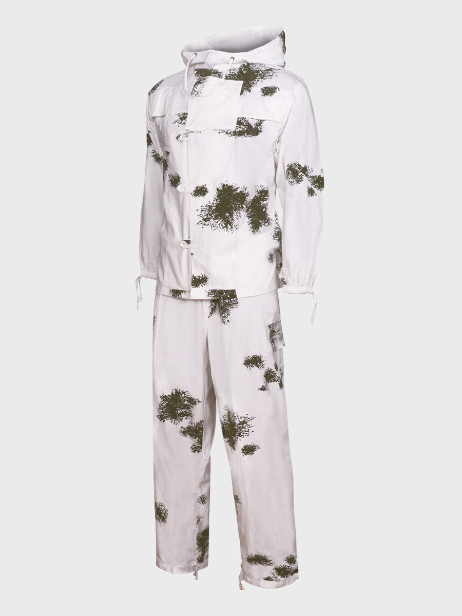 Wykonany z mocnej tkaniny bawełnianej. Biały kolor i plamy przypominające gałązki drzewa iglastego zapewniają doskonały kamuflaż w otwartym terenie i lesie. Zestaw składa się z bluzy, spodni i kaptura. Luźny krój maskałaty zapewnia wygodę i swobodę ruchów nawet z grubą odzieżą zimową, dodatkowo kamufluje poprzez rozmycie kształtu sylwetki.