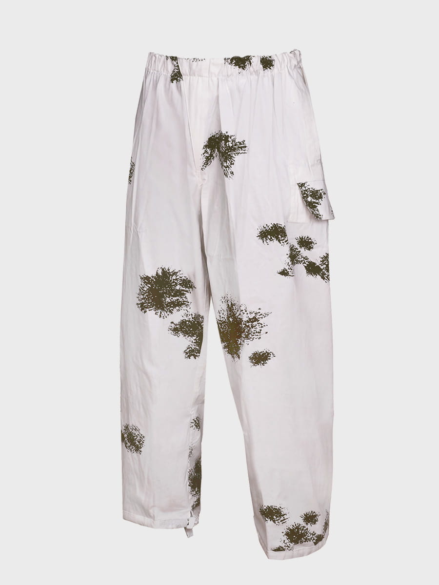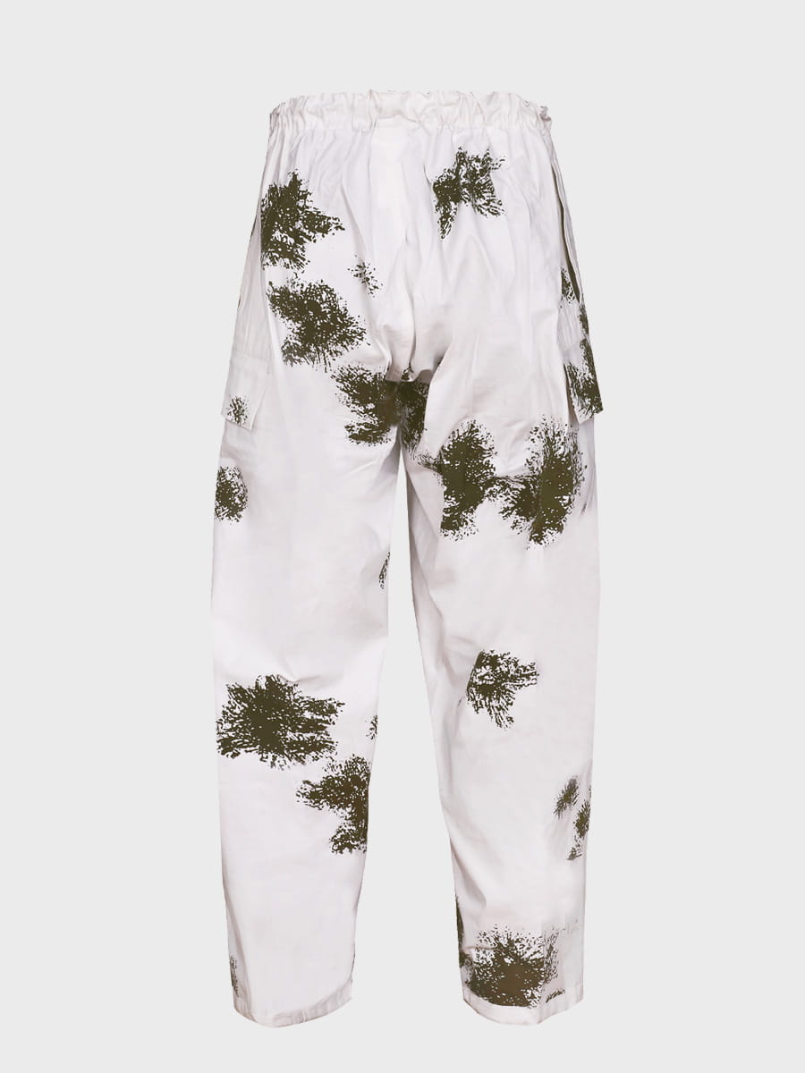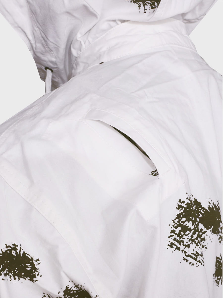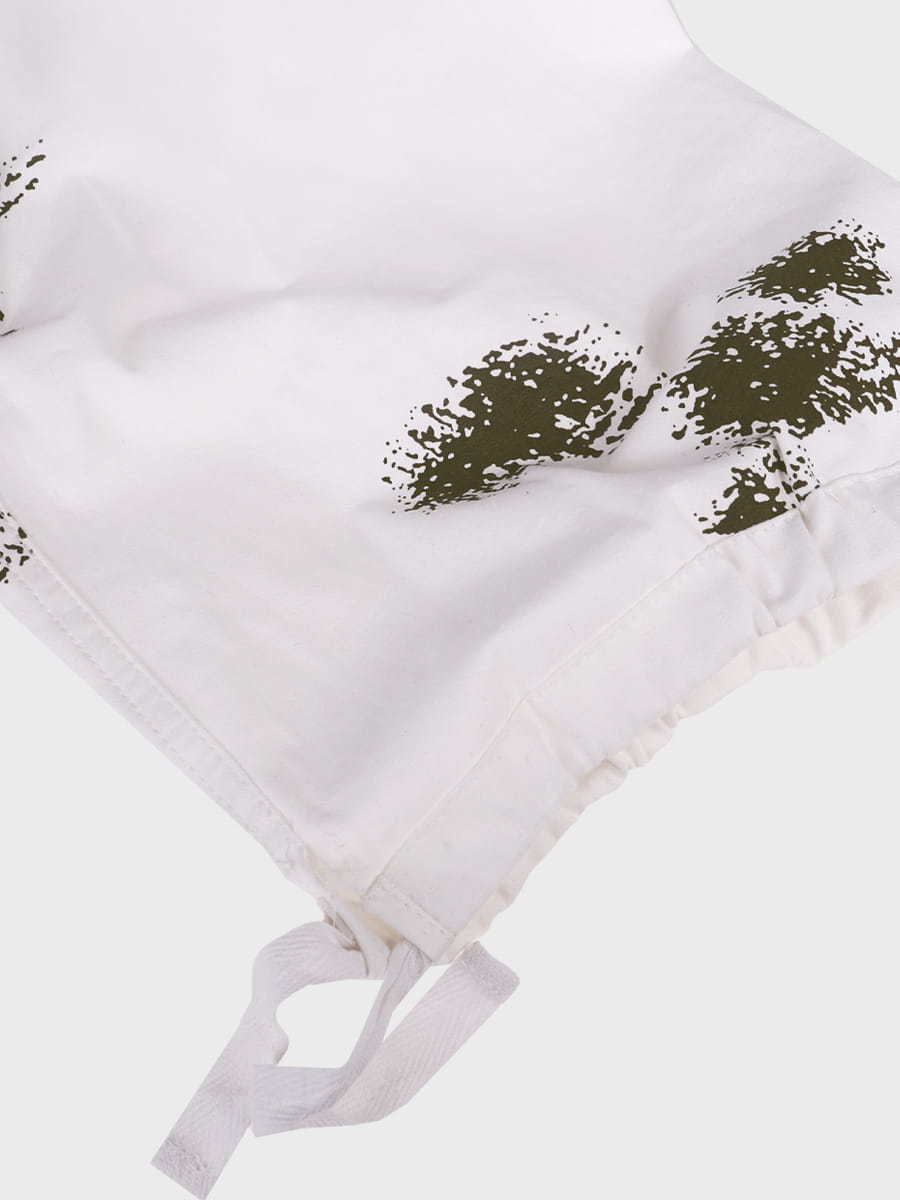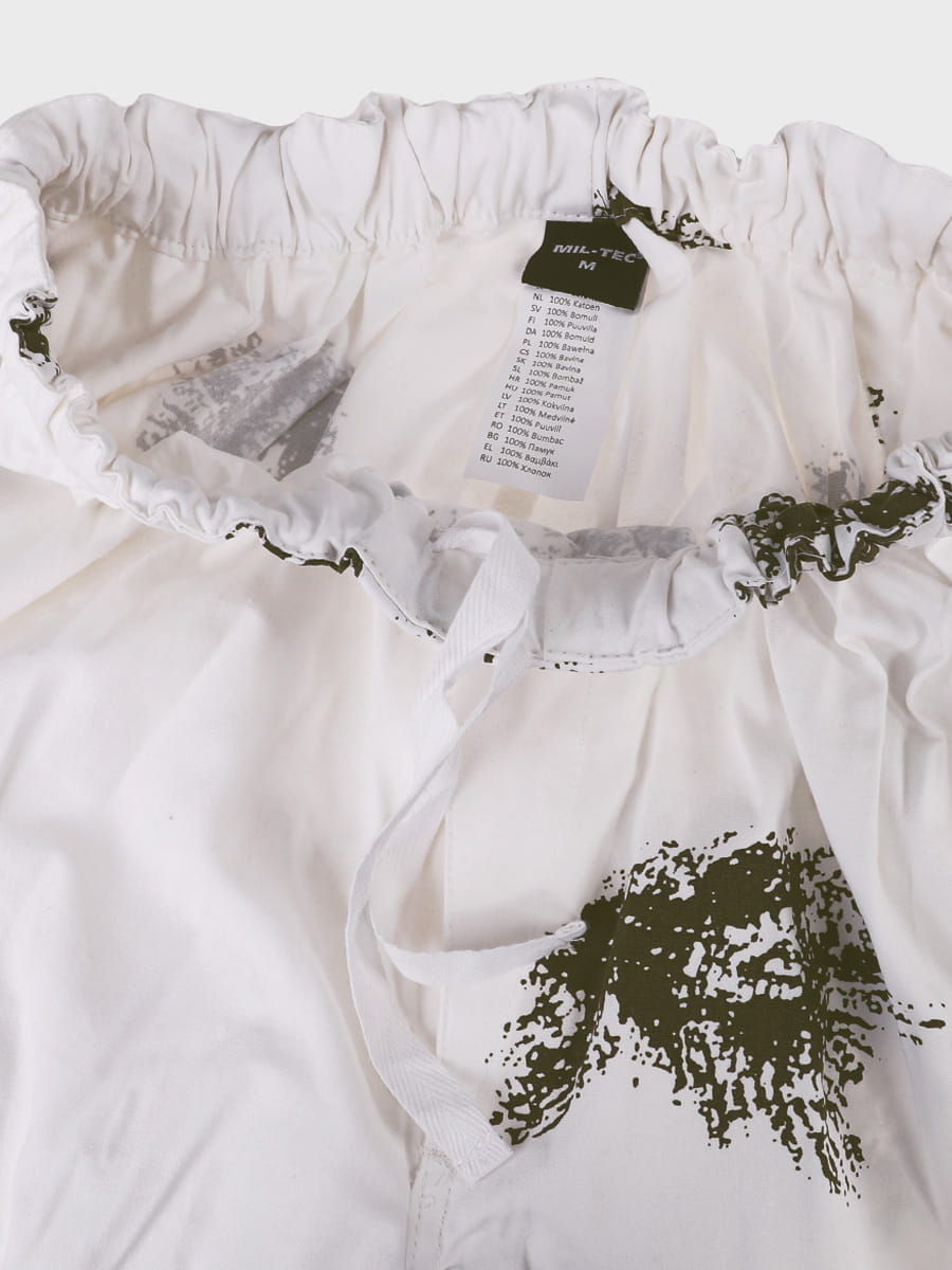 Wykonany z mocnej tkaniny bawełnianej. Biały kolor i plamy przypominające gałązki drzewa iglastego zapewniają doskonały kamuflaż w otwartym terenie i lesie. Zestaw składa się z bluzy, spodni i kaptura. Luźny krój maskałaty zapewnia wygodę i swobodę ruchów nawet z grubą odzieżą zimową, dodatkowo kamufluje poprzez rozmycie kształtu sylwetki.