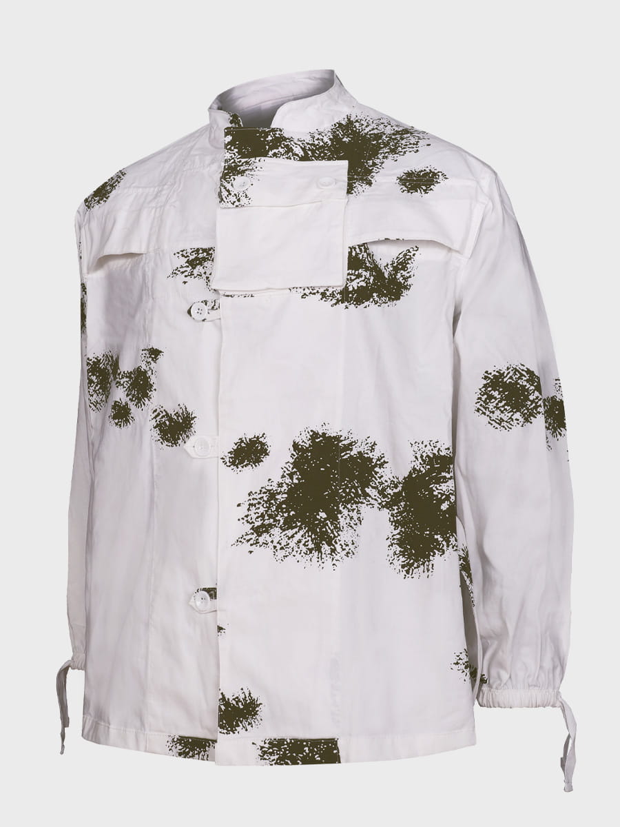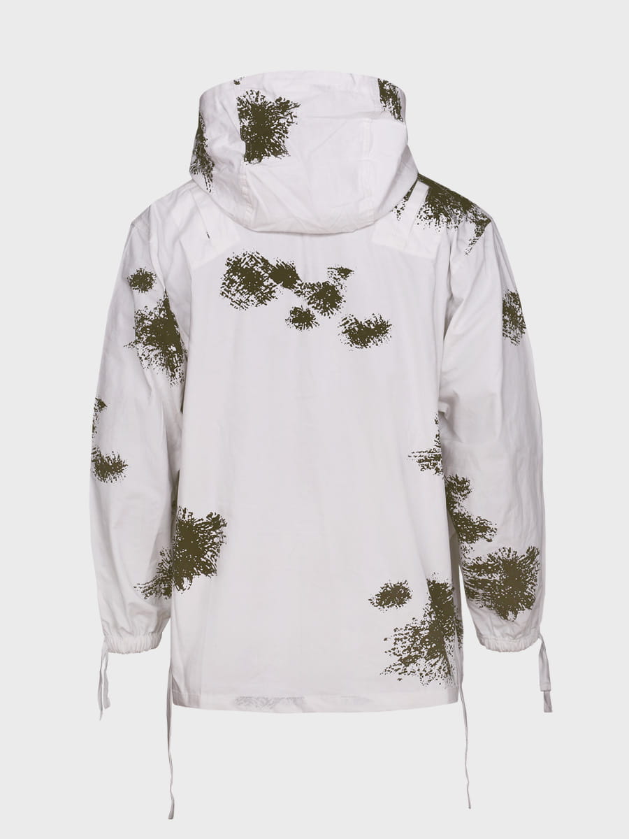 Bluza zapinana tasiemkami na guziki. Wyposażona w wygodną kieszeń na piersi i dodatkową wewnętrzną. System krytych szczelin, specjalne otwory dają dostęp do kieszeni ubrania pod kamuflażem (dwie na piersi, dwie na brzuchu). Mankiety wykończone gumką. Tasiemki w pasie do regulacji obwodu talli, zabezpieczają przed podwiewaniem i dostawaniem się śniegu pod kamuflaż. Na plecach umieszczone kryte szczeliny na szelki. Duży, odpinany kaptur ze ściągaczem i możliwością założenia na głowę lub hełm.