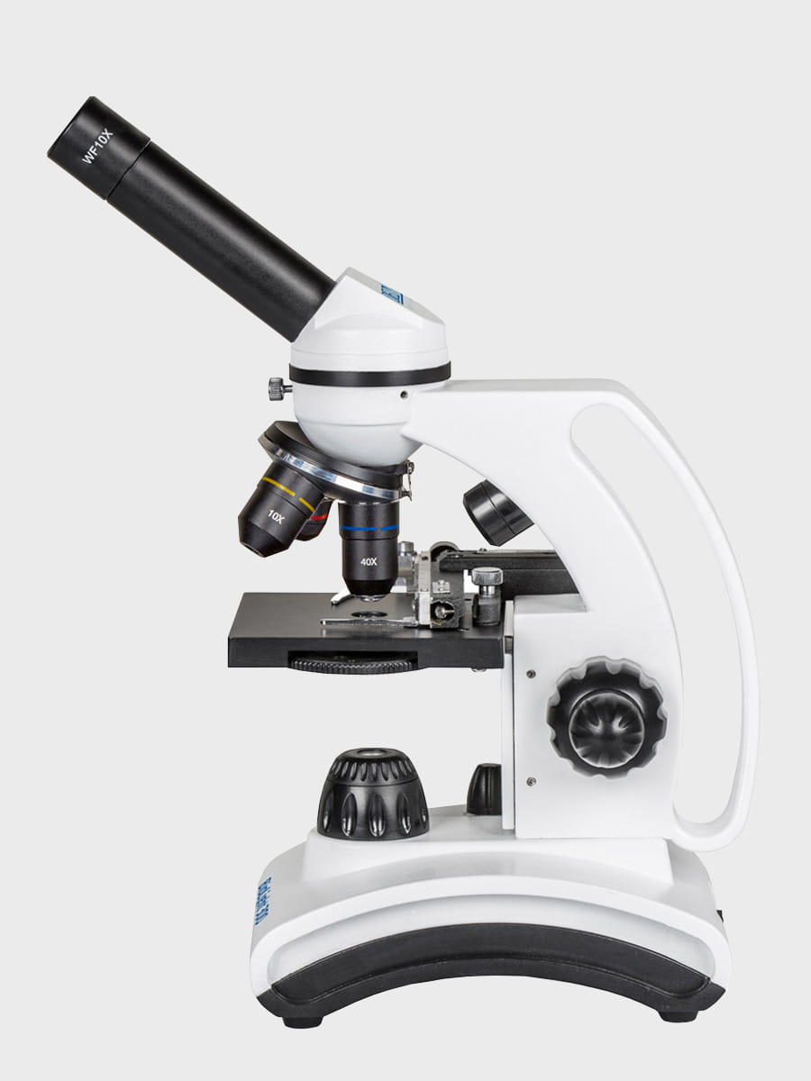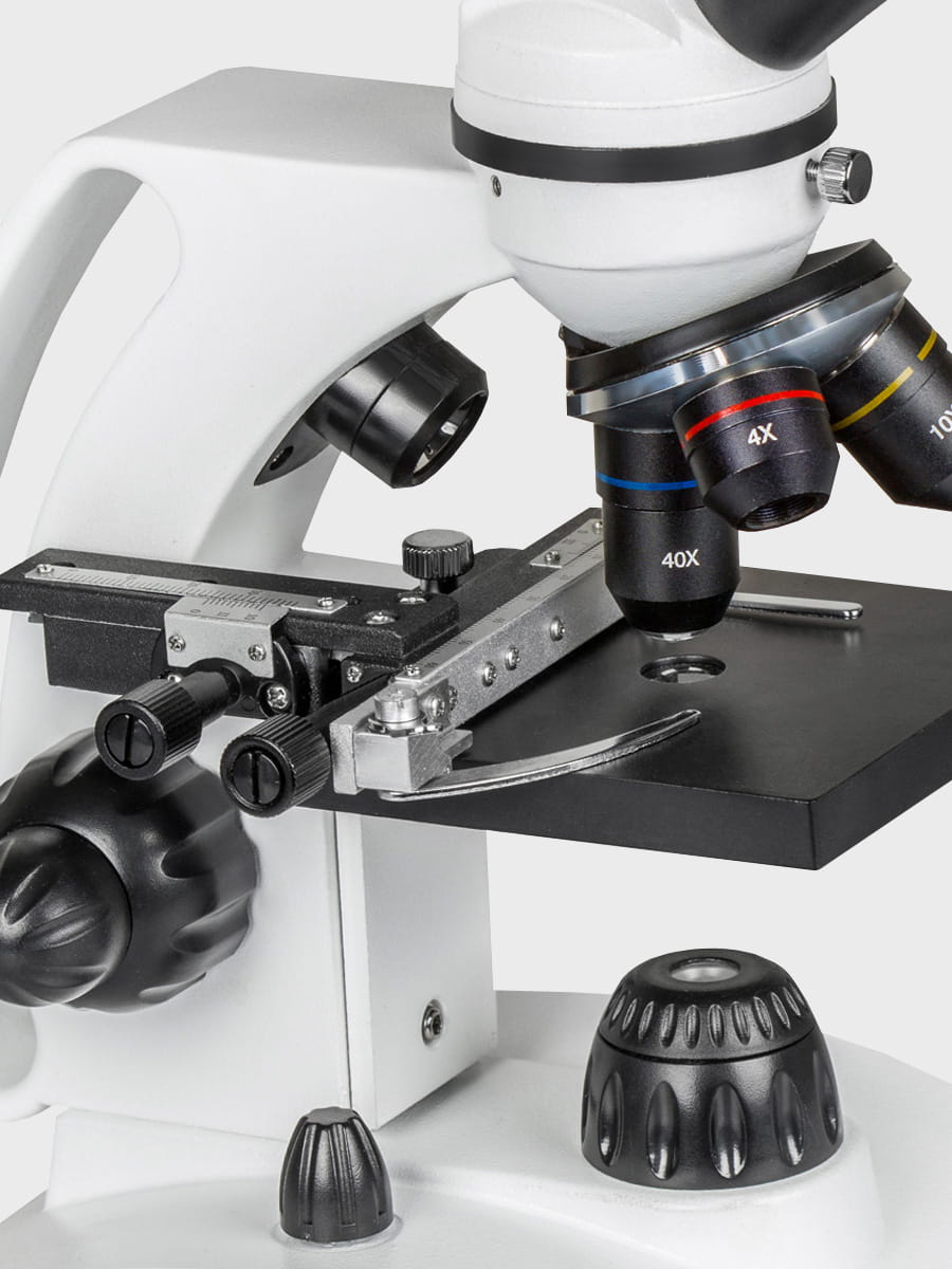 Solidny, metalowy statyw oraz praktyczny stolik mechaniczny z naniesioną podziałką ułatwiają precyzyjne przesuwanie preparatu, co stanowi istotne udogodnienie dla młodego użytkownika.