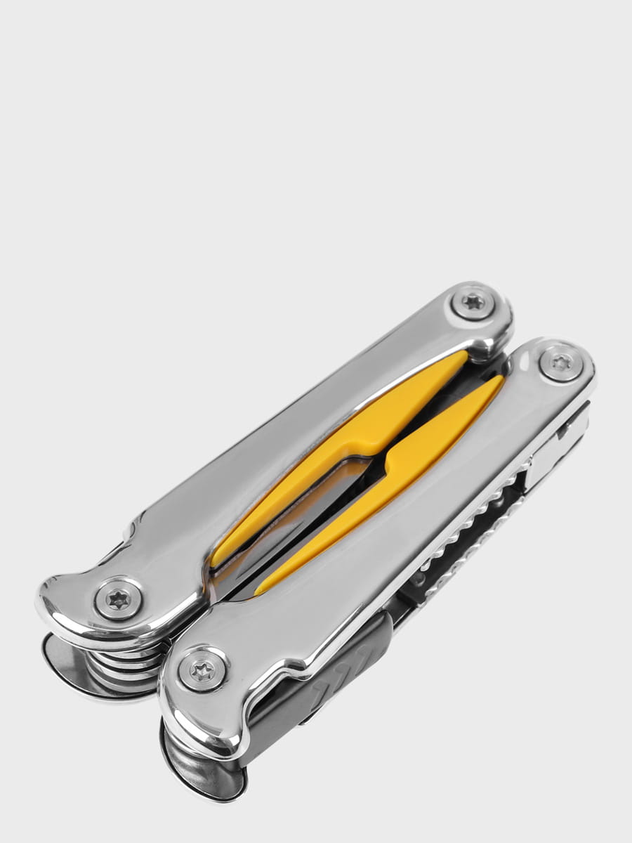 Posiada dwa rozmiary śrubokrętu płaskiego, śrubokręt krzyżakowy oraz otwieracz do butelek z funkcją śrubokrętu. Zestaw narzędzi uzupełnia: piłka, nóż o gładkim ostrzu, ostry otwieracz do puszek i dwustronny pilnik.