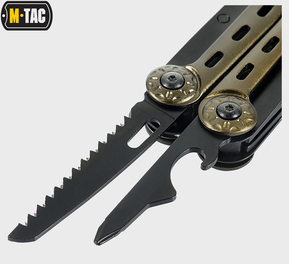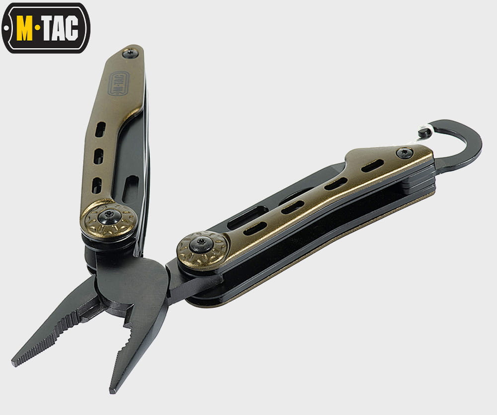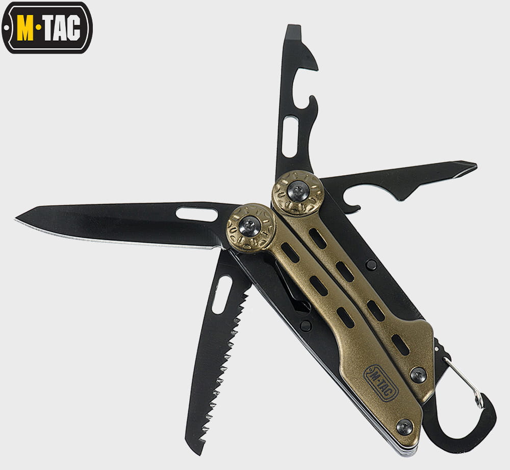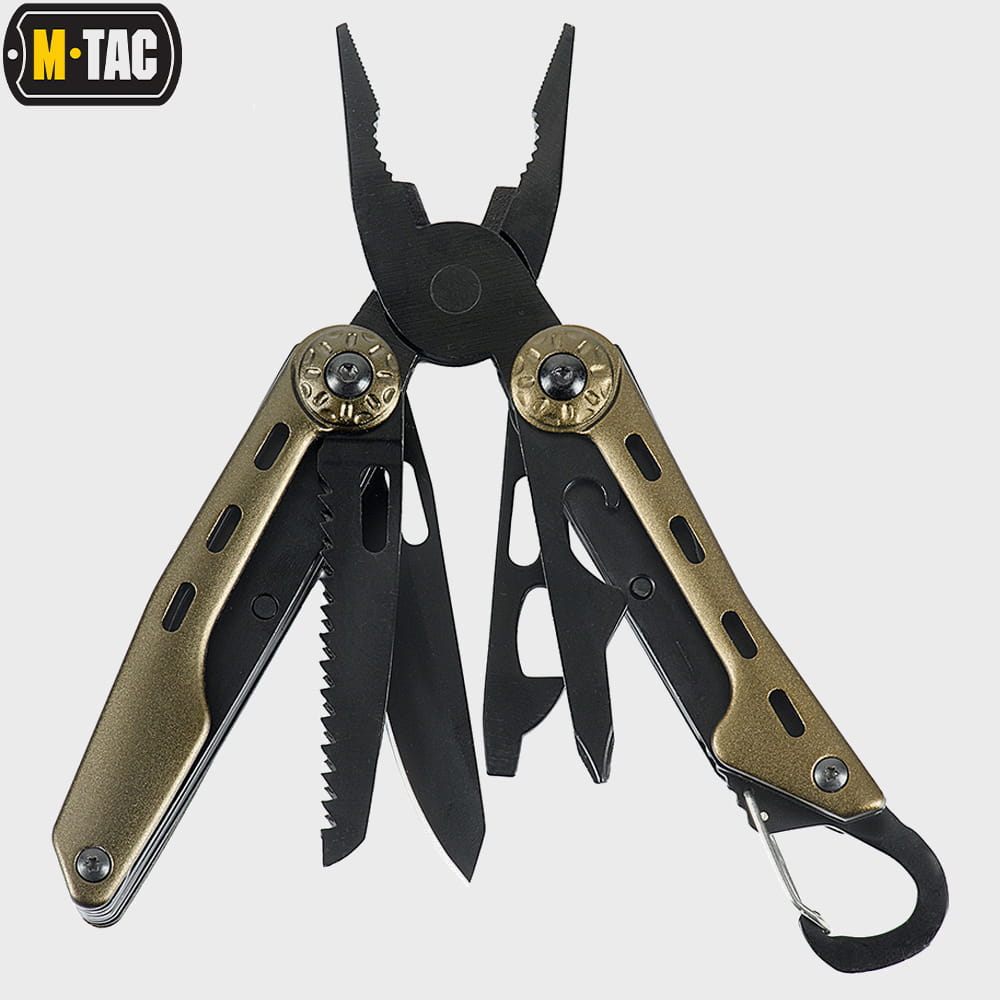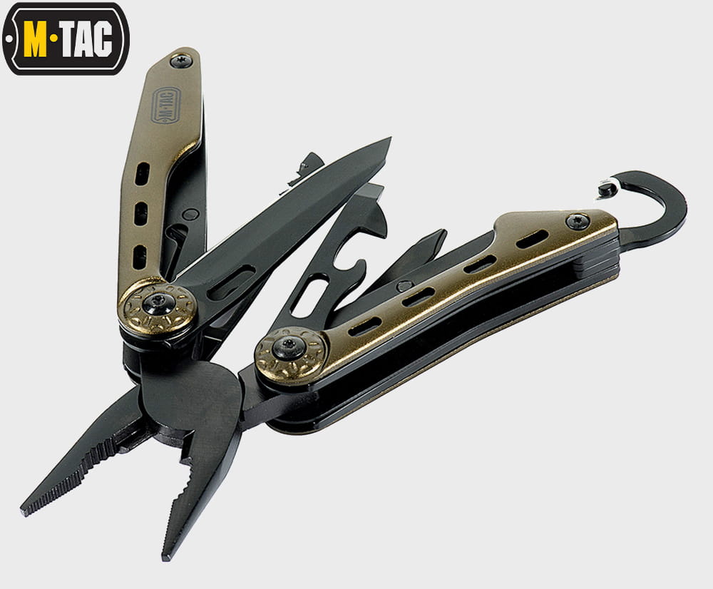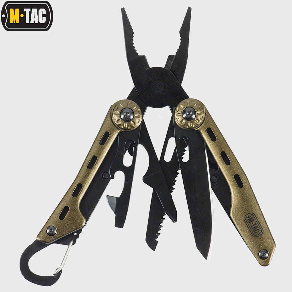 Multitool Type 5 marki M-Tac to zestaw praktycznych narzędzi i wielu funkcji w jednym, który wykonany został z wysokiej jakości materiałów. Zestaw zawiera starannie przemyślane i dobrane narzędzia: nóż, kombinerki, śrubokręt, otwieracz do puszek, otwieracz do butelek, przecinak do pasów parcianych, piłkę do metalu, pilnik, nożyczki i szydło.