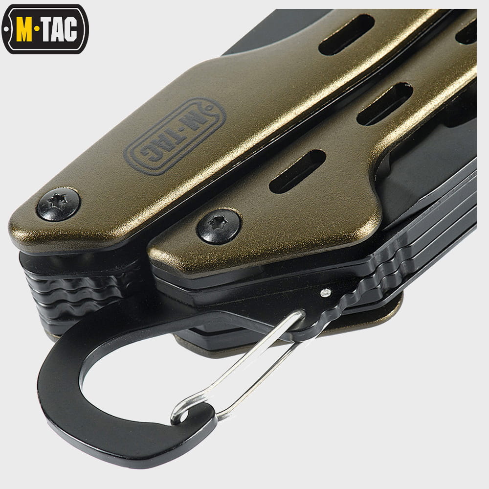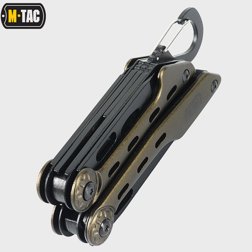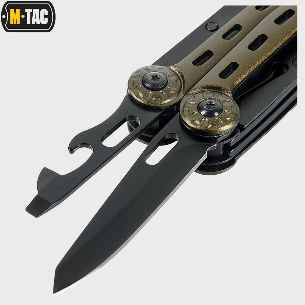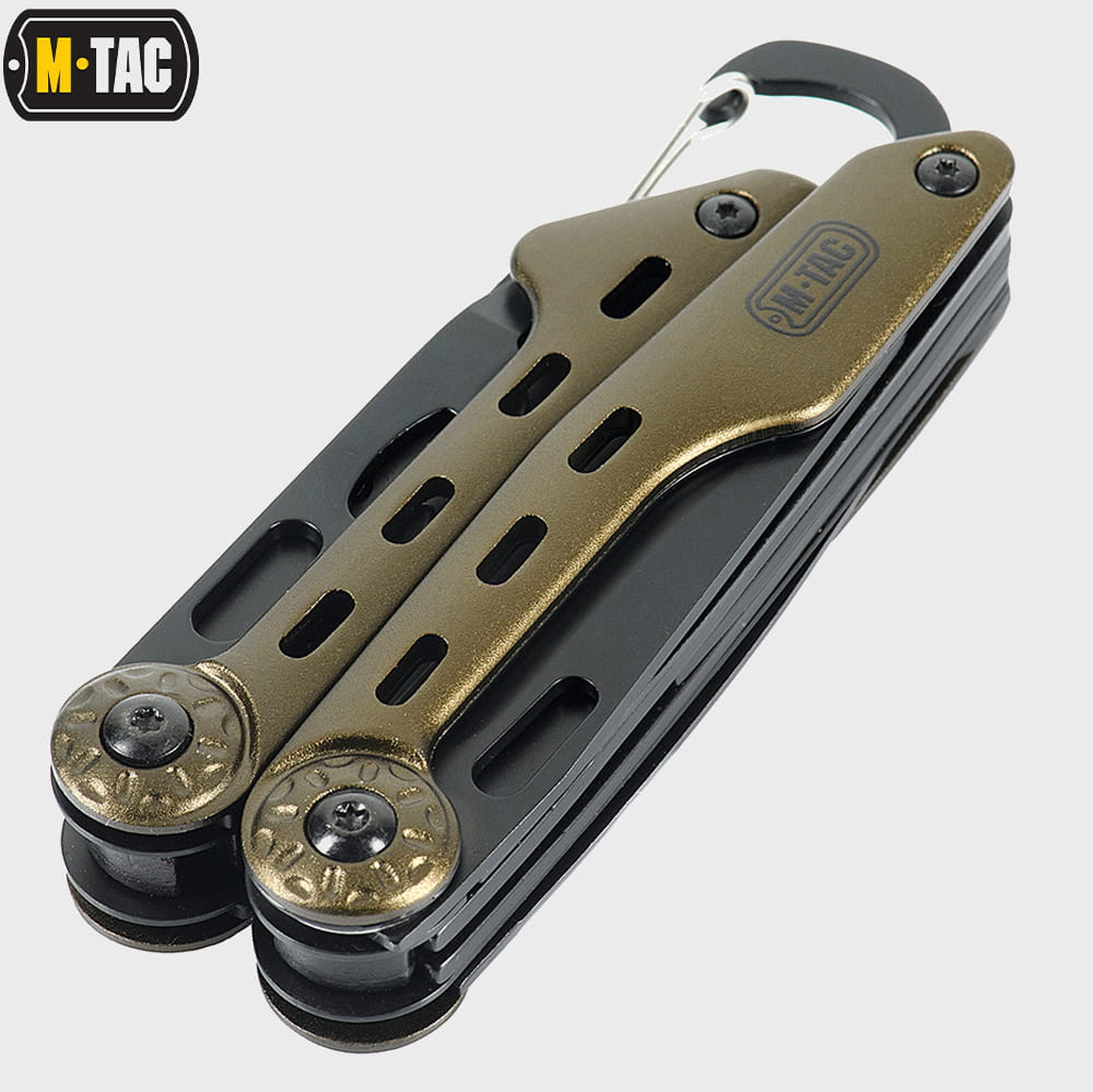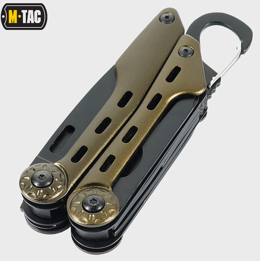 Multitool Type 5 marki M-Tac to zestaw praktycznych narzędzi i wielu funkcji w jednym, który wykonany został z wysokiej jakości materiałów. Zestaw zawiera starannie przemyślane i dobrane narzędzia: nóż, kombinerki, śrubokręt, otwieracz do puszek, otwieracz do butelek, przecinak do pasów parcianych, piłkę do metalu, pilnik, nożyczki i szydło.