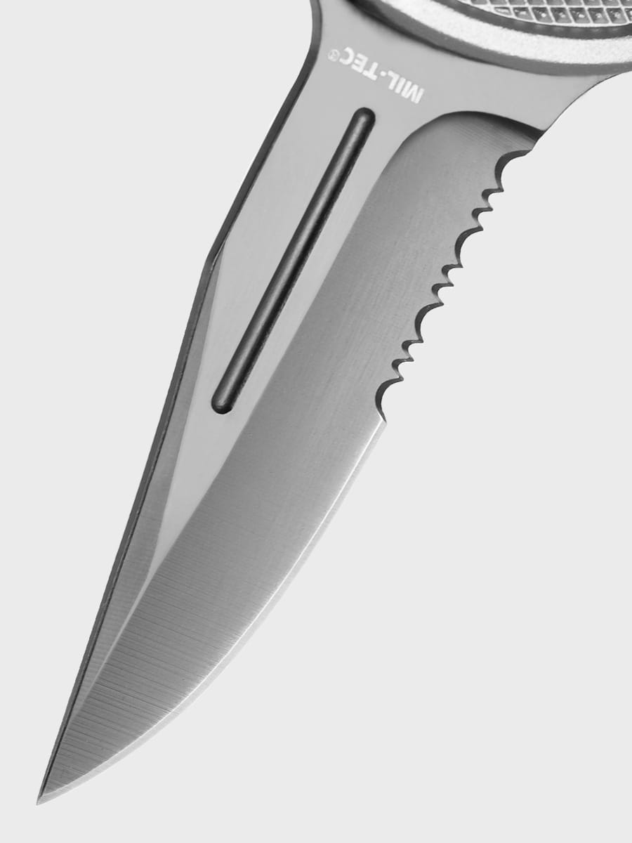 Nóż Ratunkowy "Rescue Paramedic" marki Mil-Tec. Głownia typu Drop Point wykonana została z wysokiej jakości stali nierdzewnej 440 o grubości 2,5mm. Całość dodatkowo została oksydowana, dzięki czemu zwiększono jego odporność na korozję i zniwelowano refleksy świetlne.