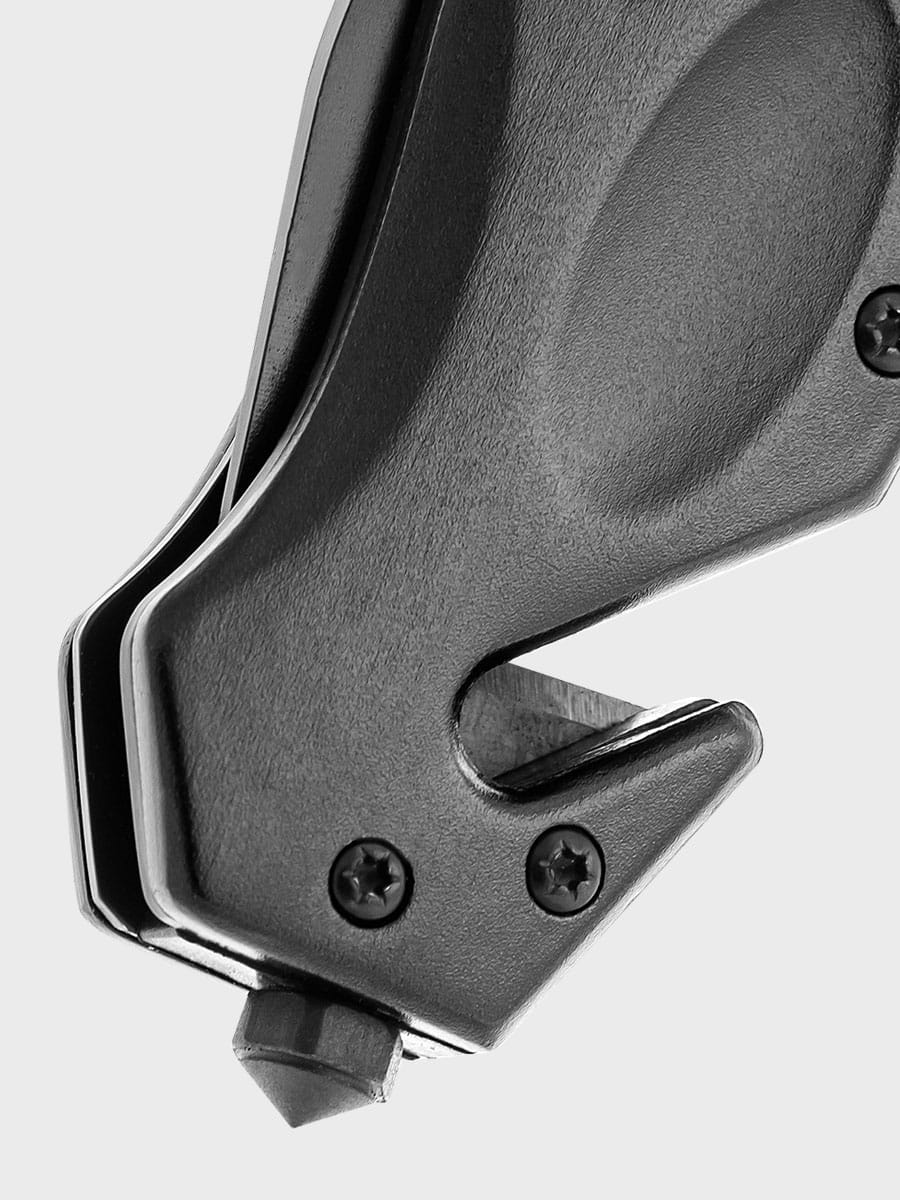 Model wyposażony w zbijak do szyb i dodatkowe ostrze do cięcia pasów.