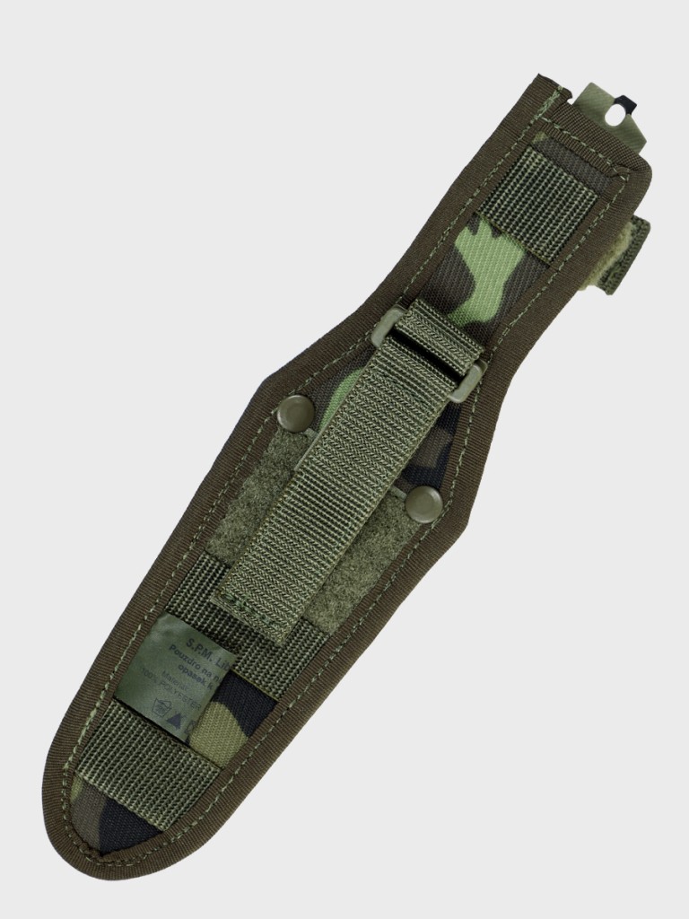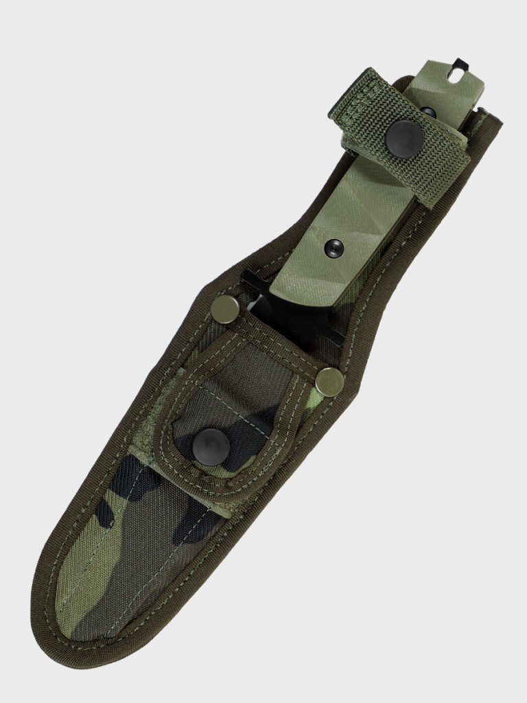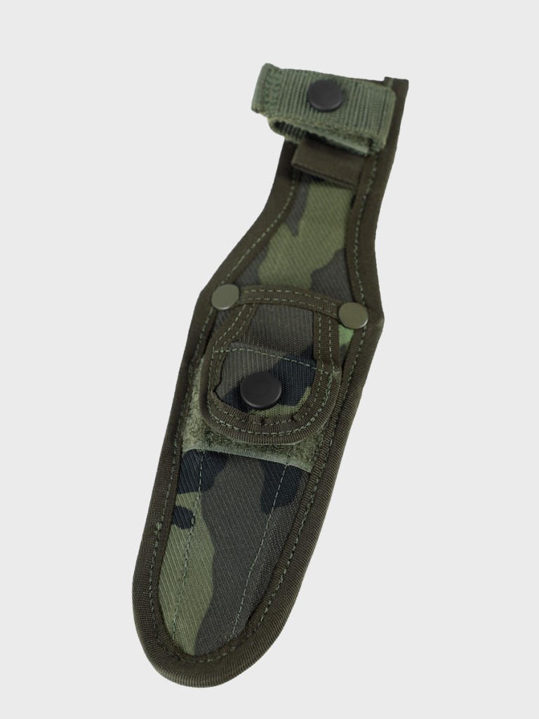 Kamuflażowa pochwa z opcją mocowania do pasa zapewnia szybki dostęp i bezpieczne przenoszenie.