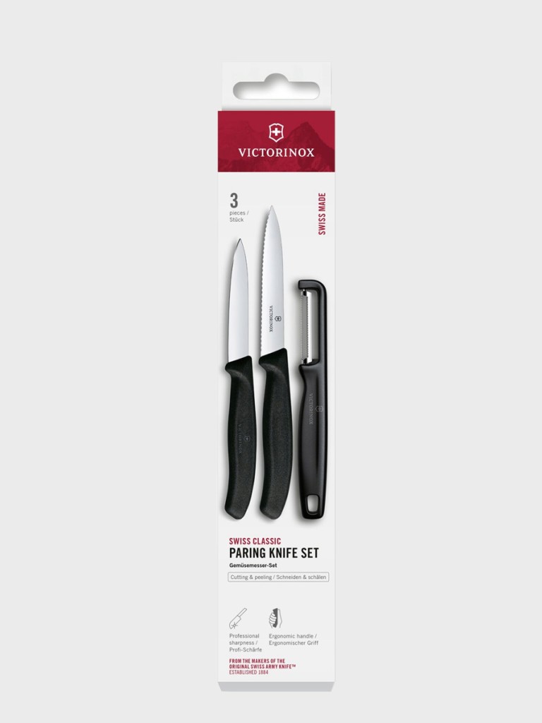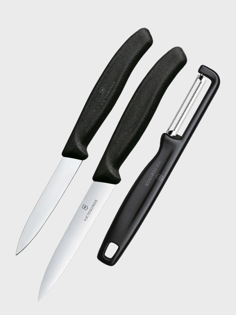 Zestaw Victorinox 6.7113.33 to praktyczne trio, które sprawdzi się w każdej kuchni – zarówno domowej, jak i profesjonalnej. Wykonane ze stali nierdzewnej ostrza gwarantują trwałość i ostrość, a ergonomiczne rękojeści zapewniają wygodę podczas pracy. Dzięki połączeniu noży o gładkich i ząbkowanych krawędziach oraz solidnej obieraczki, zestaw ułatwia przygotowanie warzyw, owoców, wędlin czy pieczywa. Wszystkie elementy nadają się do mycia w zmywarce, co zwiększa komfort użytkowania.