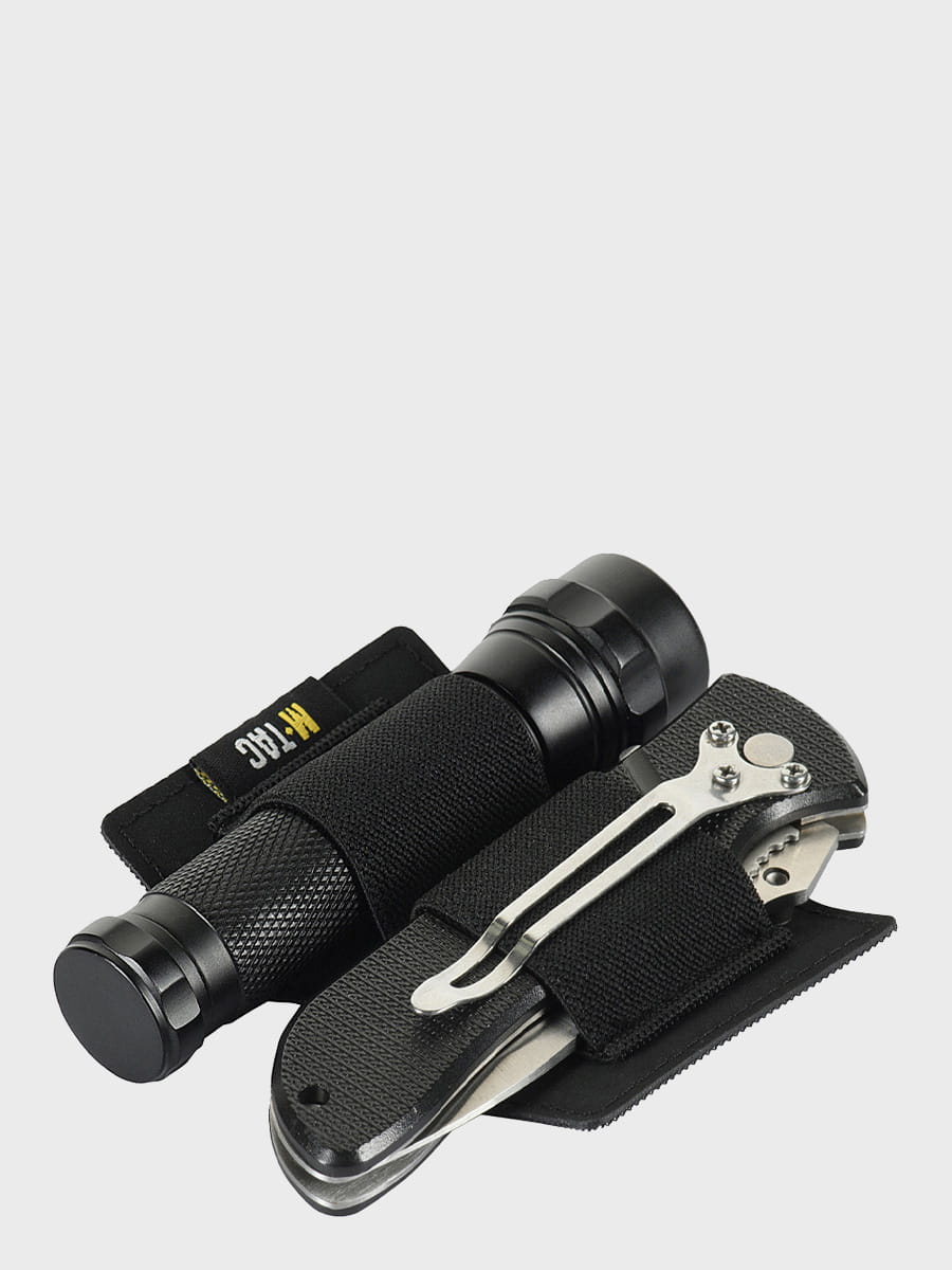 Elastyczne opaski przeznaczone są do mocowania latarki, multitoola, noża, gazu pieprzowego i innych przydatnych rzeczy.