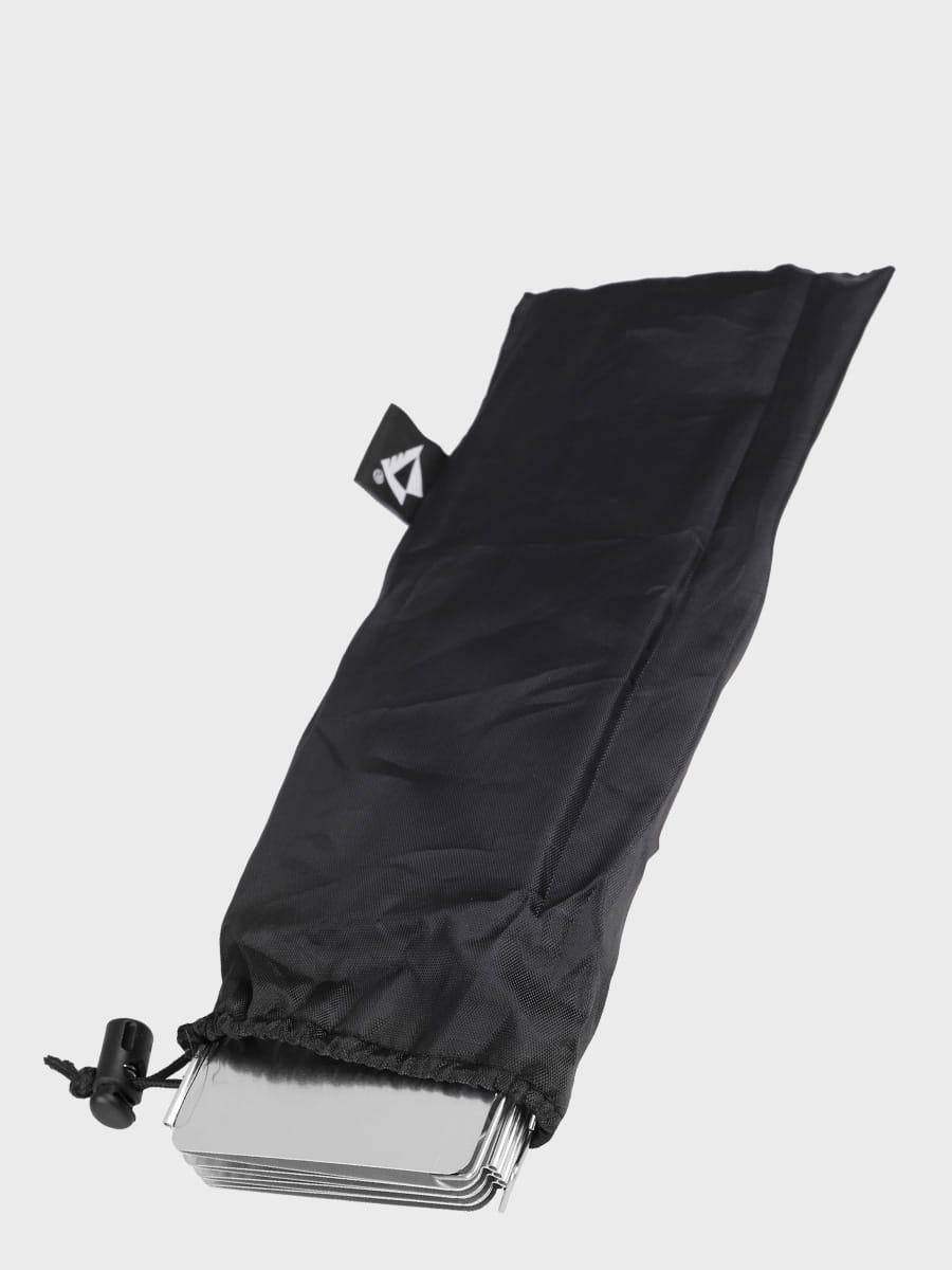 Osłona wykonana została z blachy aluminiowej, jest nierdzewna i łatwa do utrzymania w czystości. Aluminium jest bardzo lekkie, odbija część ciepła i szybko stygnie. Dół osłony został wyposażony w wycięcia, które pozwalają na jej stabilne postawienie oraz wbicie w ziemię lub śnieg. Składana do wymiarów tabliczki dużej czekolady.