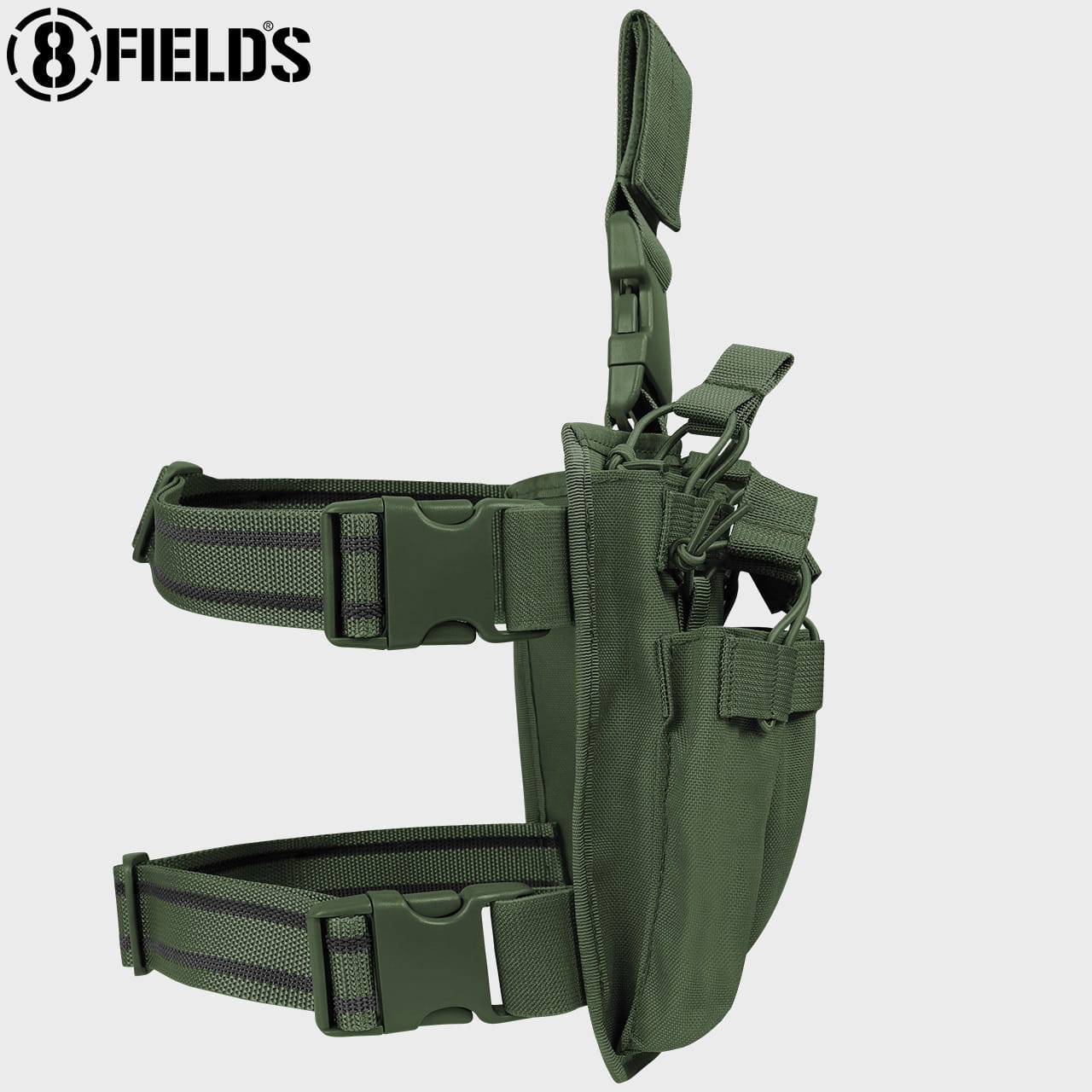 - Regulowane paski na nogi z gumowymi taśmami które redukują przesuwanie się kabury.
