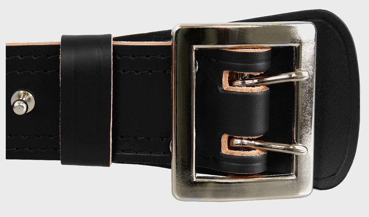 Posiada charakterystyczną dużą, metalową, dwuoczkową klamrę oraz knopik.
