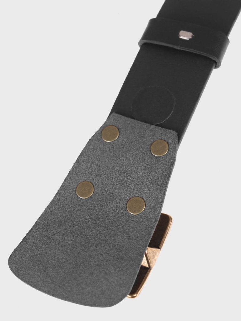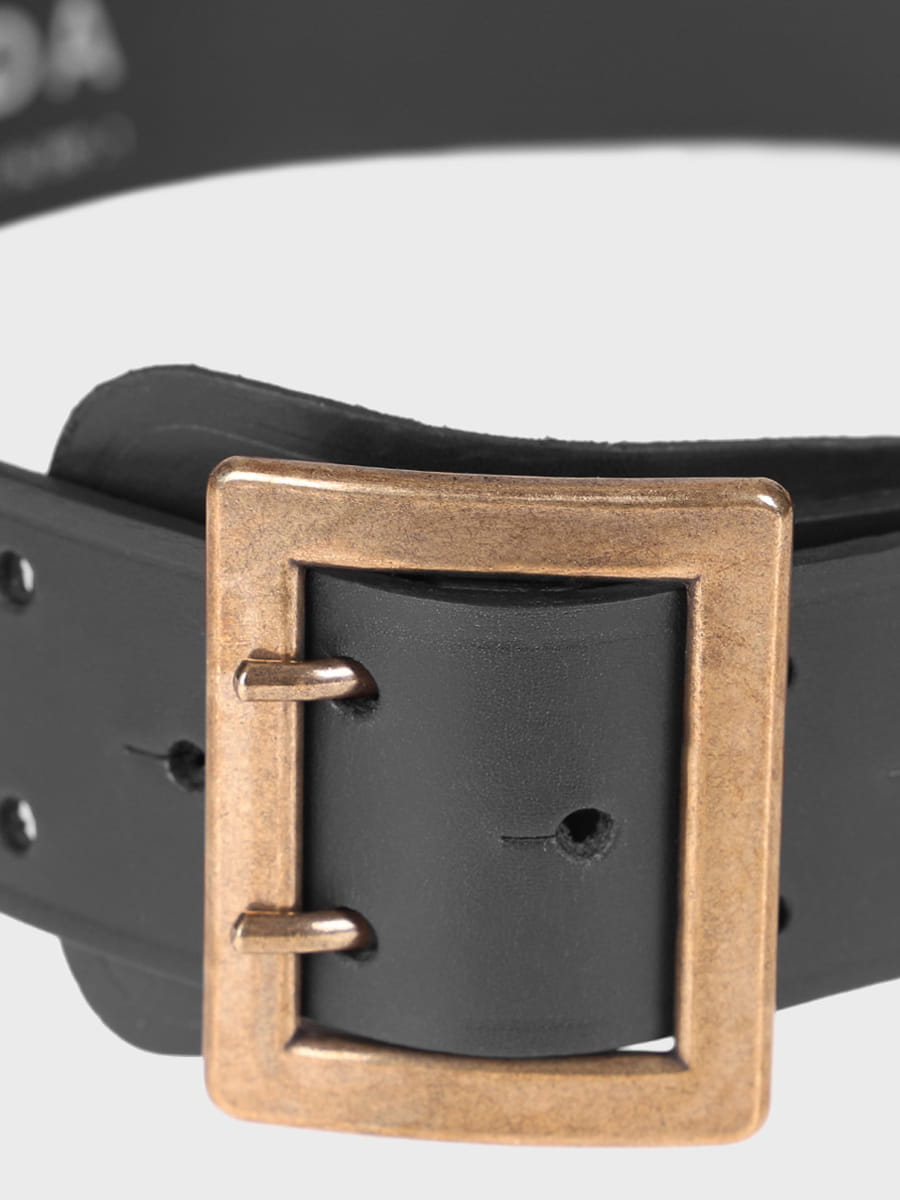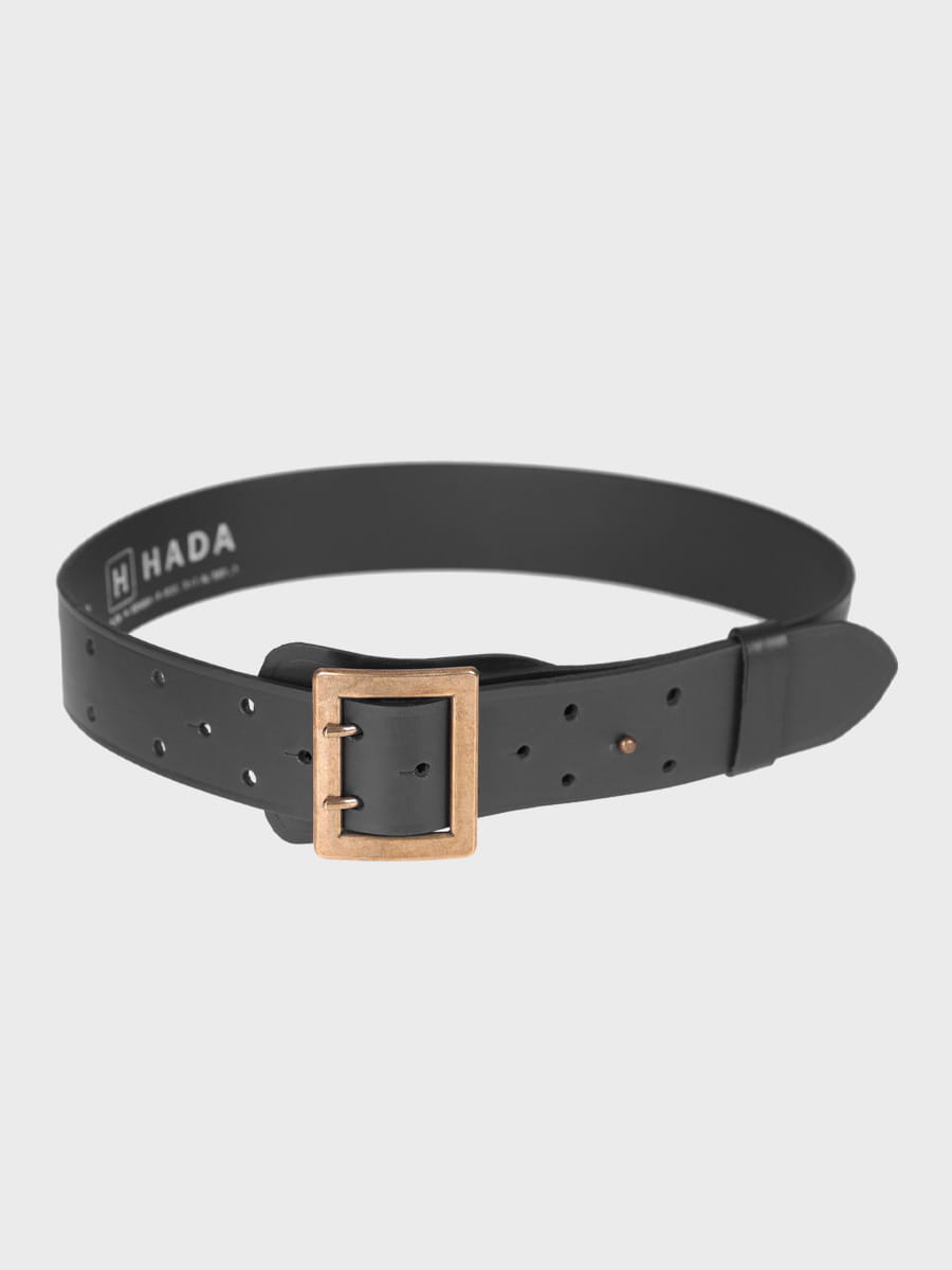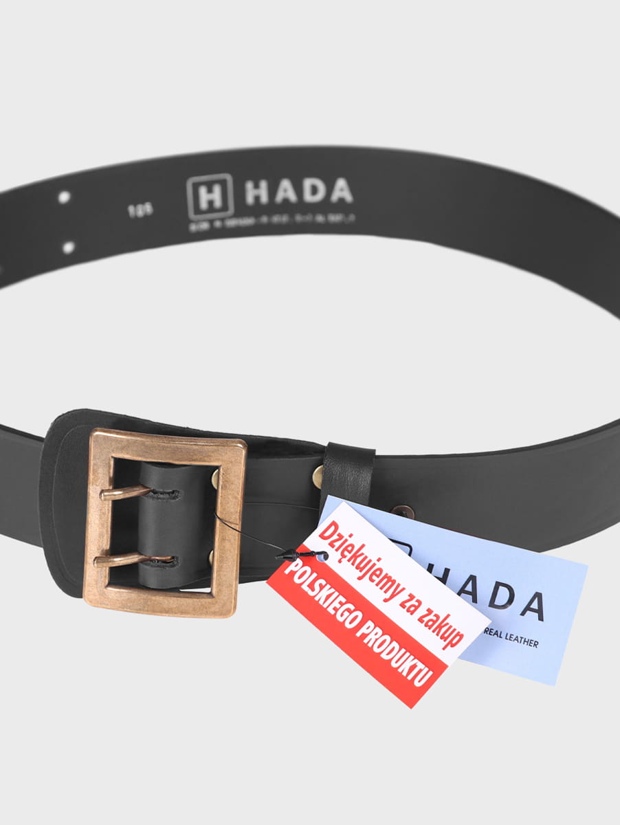 Pas z mosiężną klamrą polskiej marki HADA to klasyczny element inspirowany wyposażeniem służb mundurowych. Wykonany z naturalnej, licowanej skóry o grubości 3,5 mm, zapewnia niezawodność oraz estetyczny wygląd. Charakteryzuje się wysokiej jakości, metalową klamrą z podwójnym oczkiem i knopikiem, zamocowaną przy pomocy wytrzymałych nitów. Pod klamrą znajduje się szeroka osłona, która chroni materiał ubrania przed przetarciem.