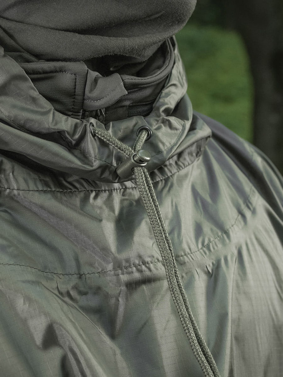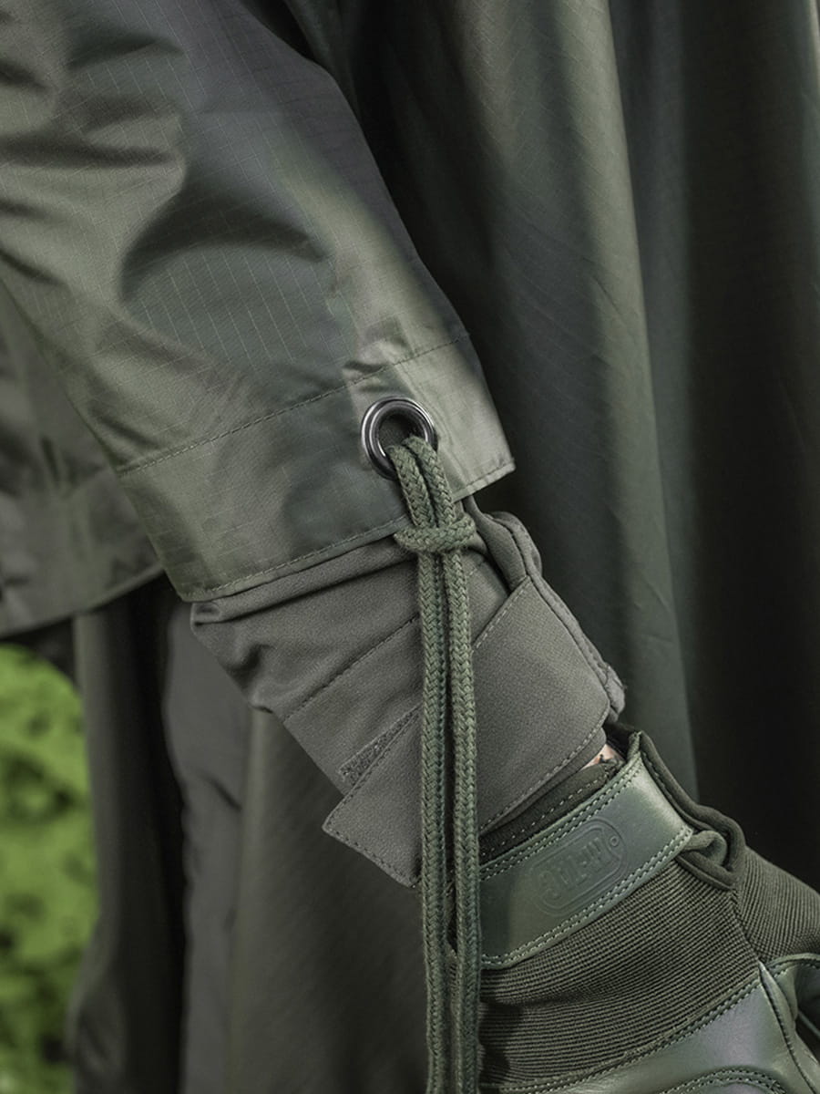 Peleryna posiada zatrzaski umożliwiające spięcie rękawów . Poncho można wykorzystać jako tarp , płachtę , plandekę lub prosty namiot.
