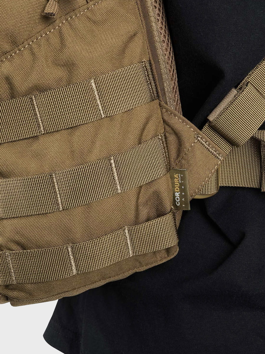 Z przodu jak i po bokach plecaka znajdują się obszycia taśmami w systemie MOLLE/PALS, dzięki którym z łatwością można troczyć dodatkowe kieszenie i zasobniki.