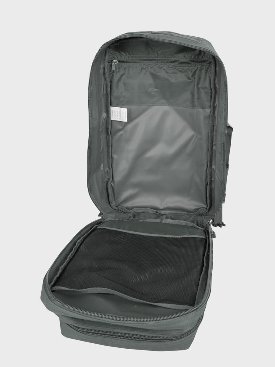 Plecak posiada system zewnętrznych pasów parcianych o szerokości 2,5 cm, umożliwiających podczepienie ładownic w systemie modułowym Molle.
