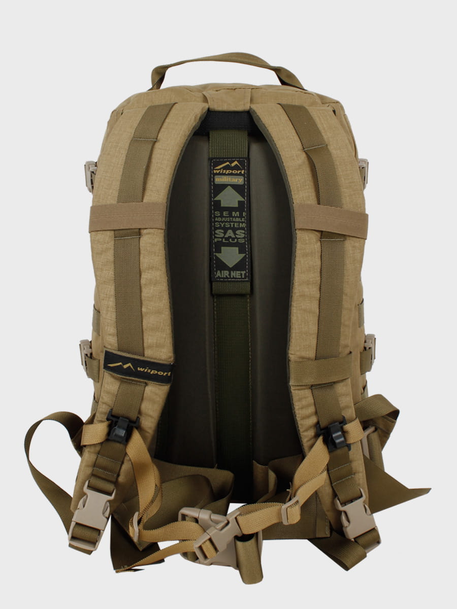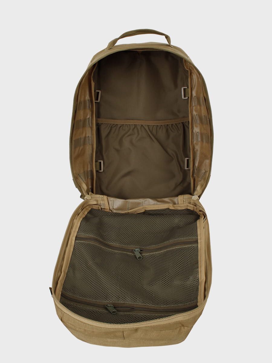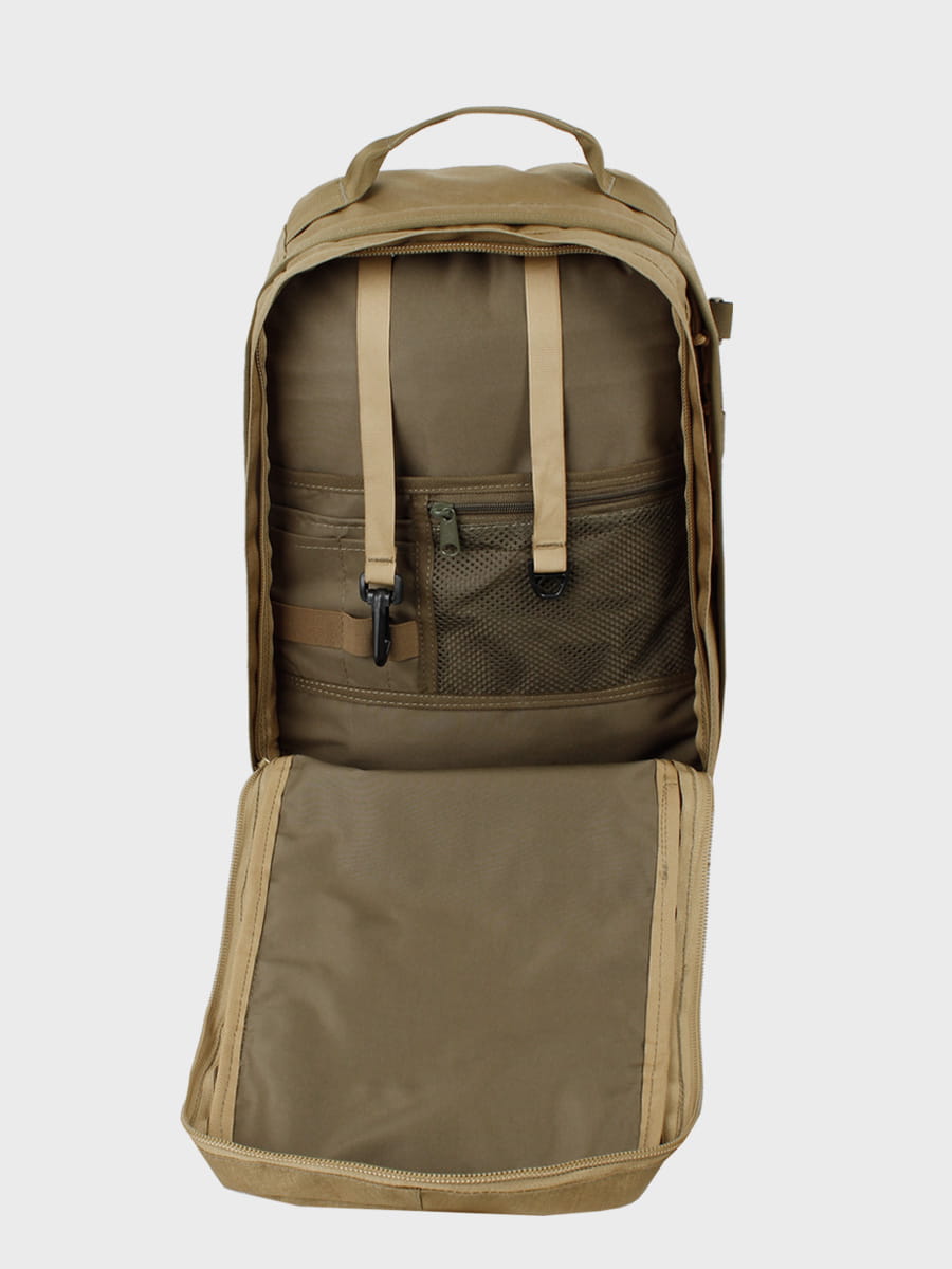 Wykonany z Cordury 500D kompaktowy plecak militarno-survivalowy – funkcjonalny i niezawodny, zaopatrzony w systemowy układ taśm, dużą ilość przegród i kieszeni.