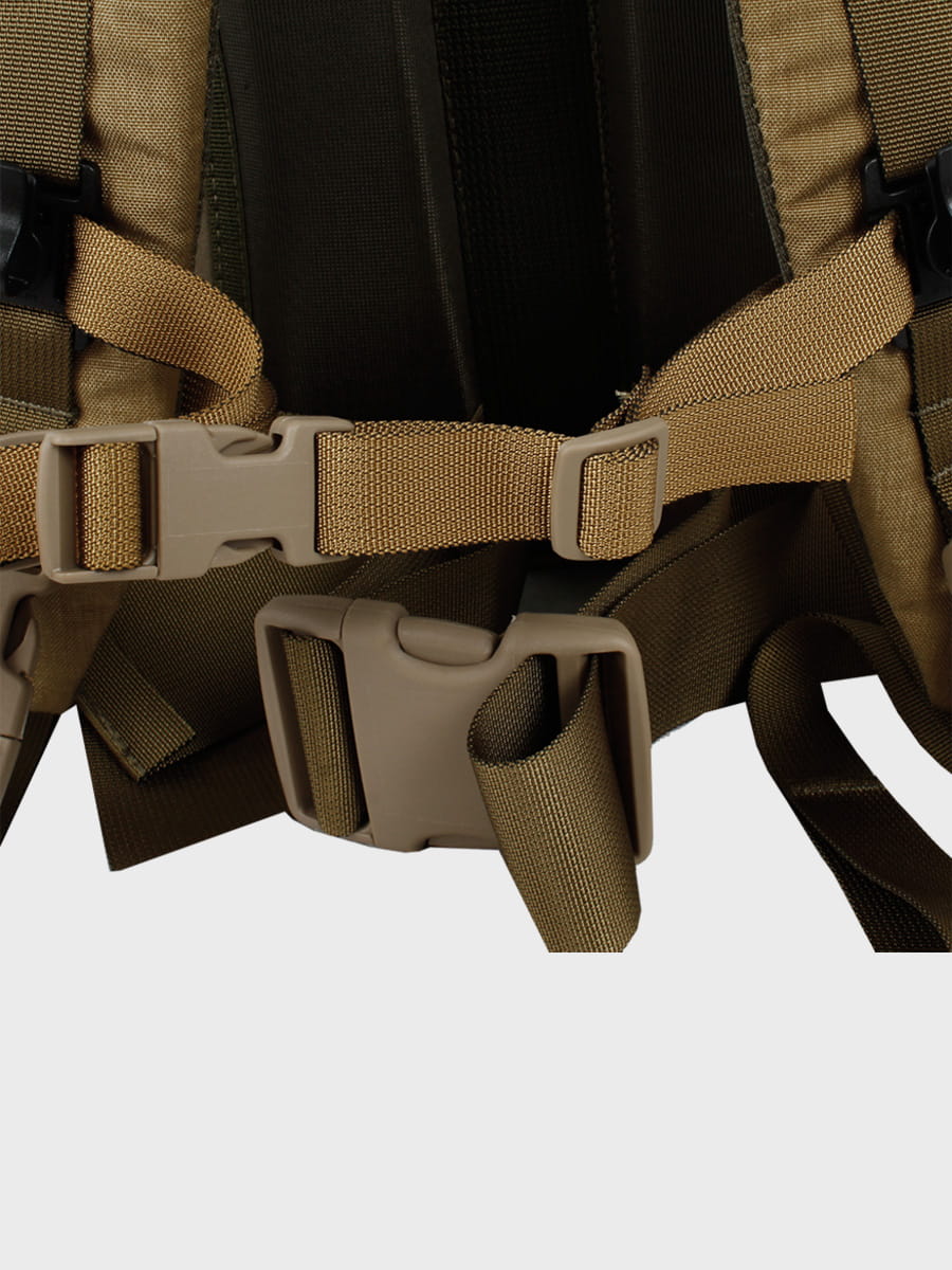 Boczne ścianki posiadają także po dwa, regulowanej długości pasy zapinane klamrami fastex 30 mm, które służą do kompresji plecaka oraz mogą być przydatne do stabilnego mocowania przenoszonego na zewnątrz ekwipunku - kurtki, płachty, karimaty, a nawet siatki maskującej.
