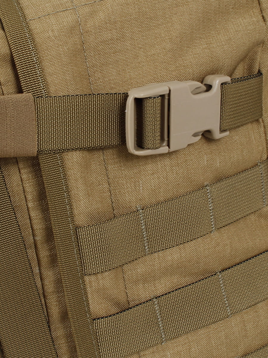 Front, dno i boczne ścianki wyposażone wtaśmy w standardzie Molle, które pozwalają przenosić na zewnątrz plecaka elementy wyposażenia urgent need (pilnej potrzeby) oraz elementy zbyt duże, aby je zmieścić wewnątrz.