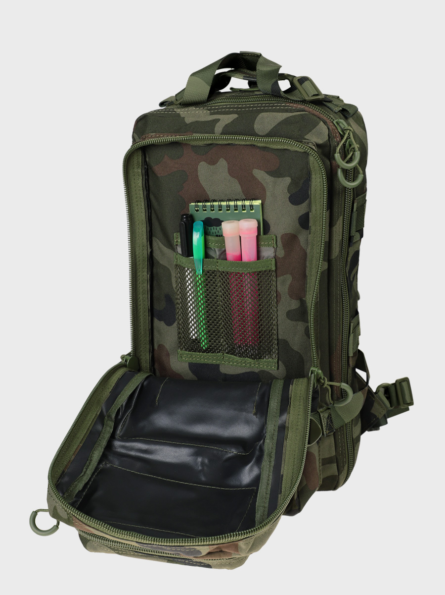 Taktyczny plecak wojskowy Shadow 30L marki DOMINATOR® to nowoczesny, wszechstronny plecak o pojemności 30 litrów, idealny zarówno do użytku militarnego, jak i codziennego. Wykonany z wytrzymałego poliestru 600D z wodoodporną wyściółką PVC, plecak zapewnia doskonałą ochronę przed deszczem i uszkodzeniami. Posiada dwie przestronne komory z kieszeniami wewnętrznymi, miniorganizer oraz miejsce na system hydracyjny.