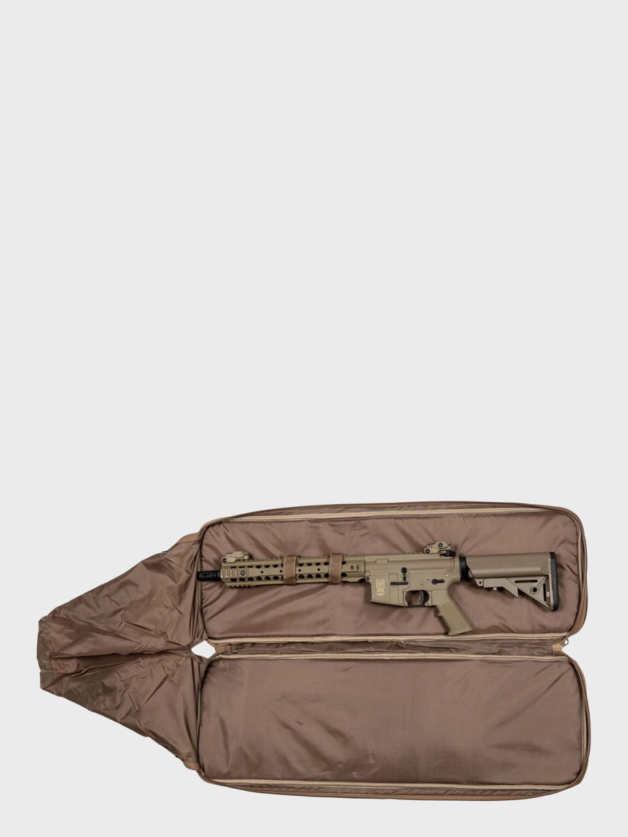 Pokrowiec wykonany jest z wytrzymałego nylonu. Wypełnienie z pianki dodatkowo zabezpiecza broń przed skutkami uderzeń oraz usztywnia ścianki.