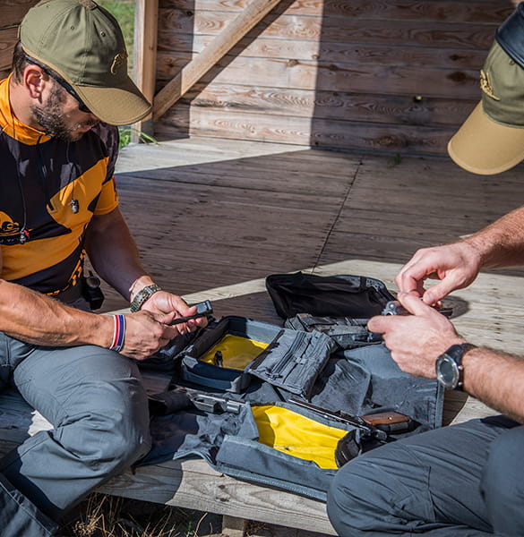 - Dodatkowa zwijana mata do czyszczenia broni i odporna na płyny techniczne, zrywana kuweta z kontrastowego materiału do czyszczenia elementów za pomocą preparatów w sprayu – całość podpinana na zewnątrz u dołu konstrukcji