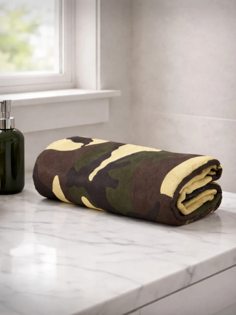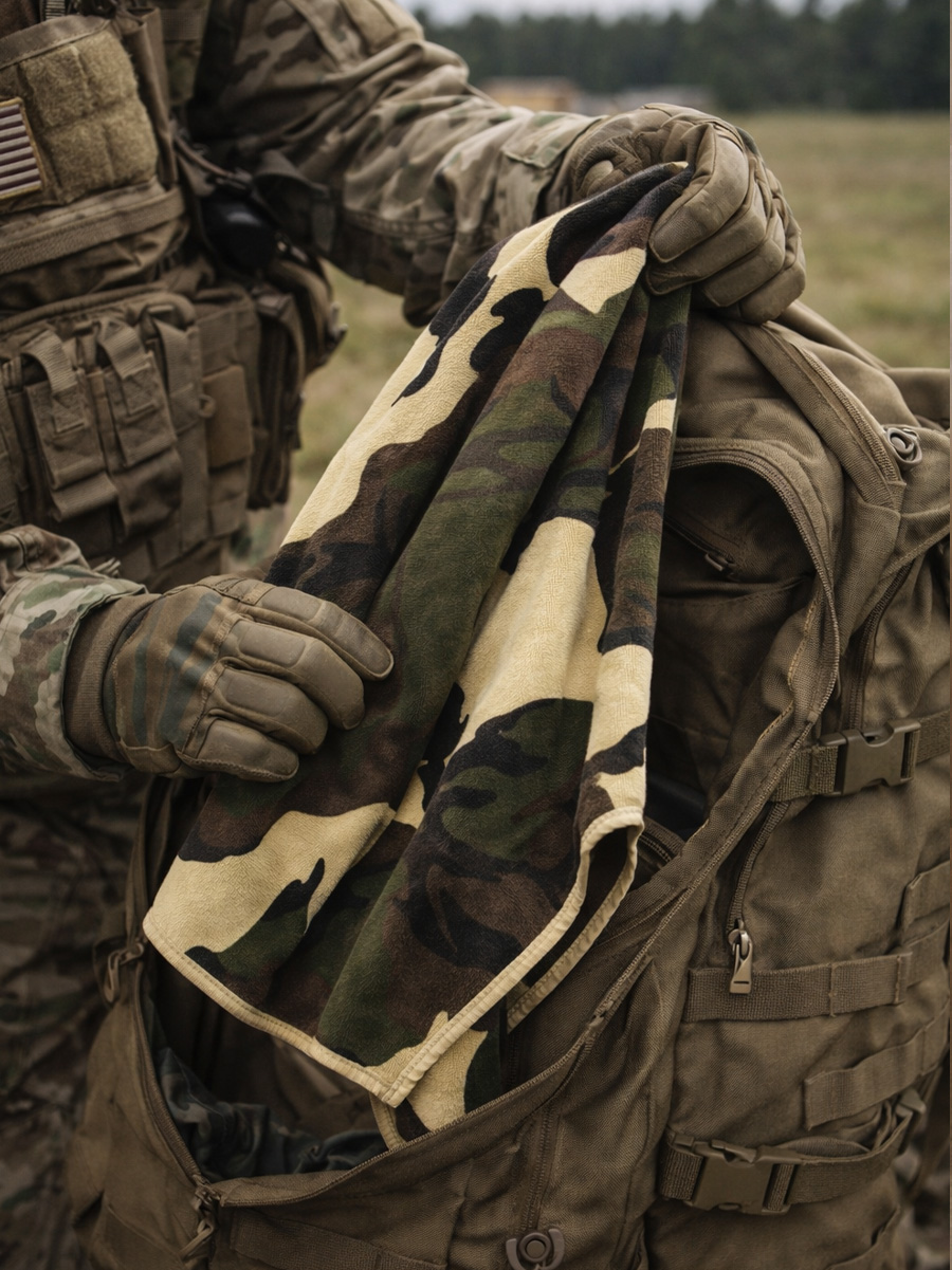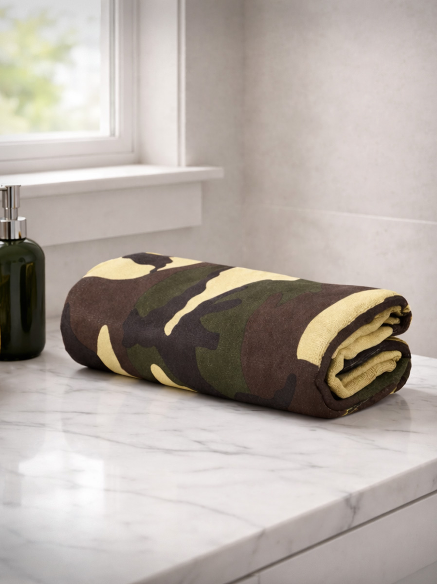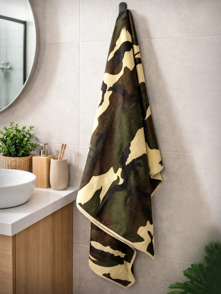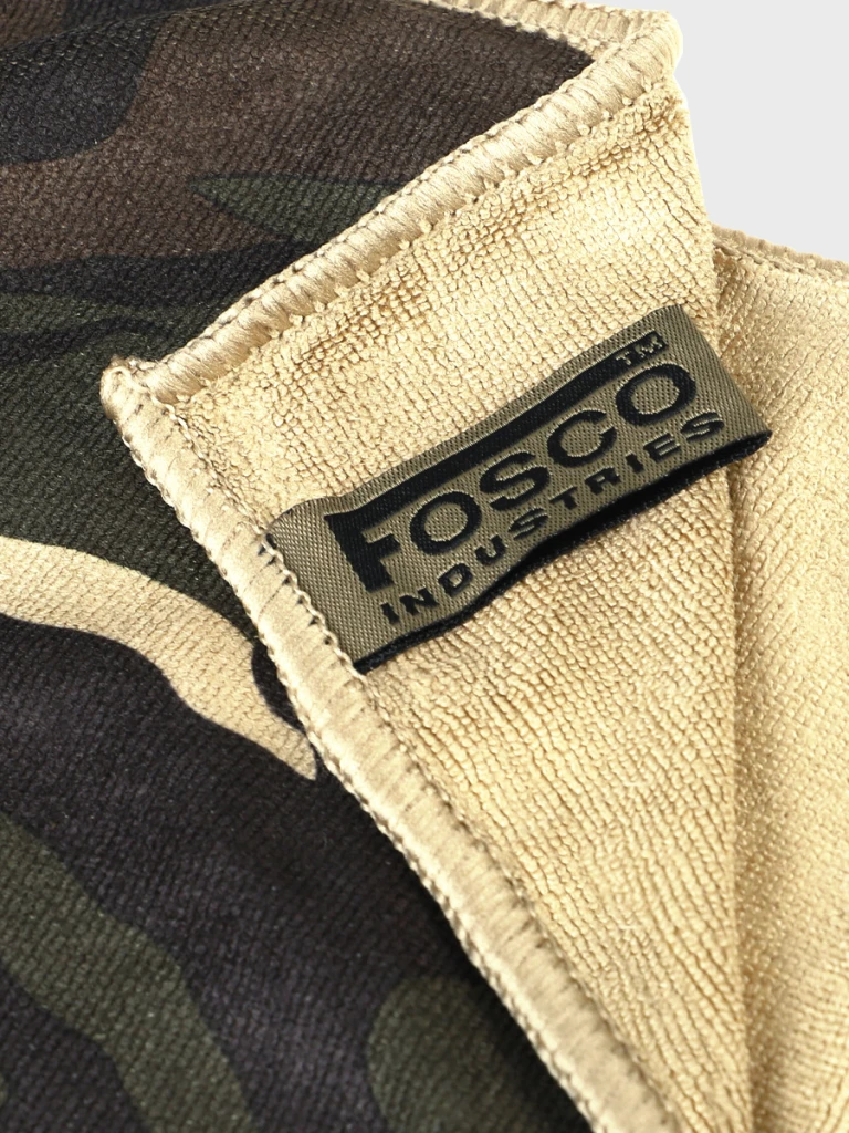 UWAGA! Przedmiotem oferty jest Fosco Ręcznik z mikrofibry w kamuflażu 120 x 60 cm. Pozostałe elementy służą przedstawieniu funkcjonalności.