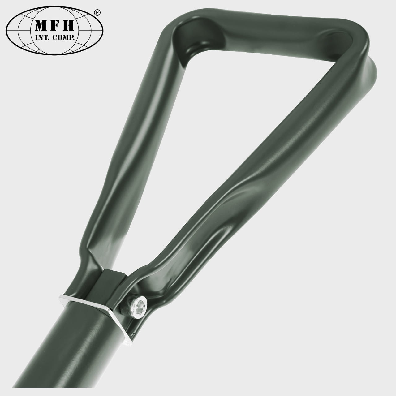 Stalowy trzonek posiada blokadę sprężynową. Kształt trójkąta pozwala na wygodną i efektywna pracę, a także daje możliwość powieszenia saperki, np. na haku.