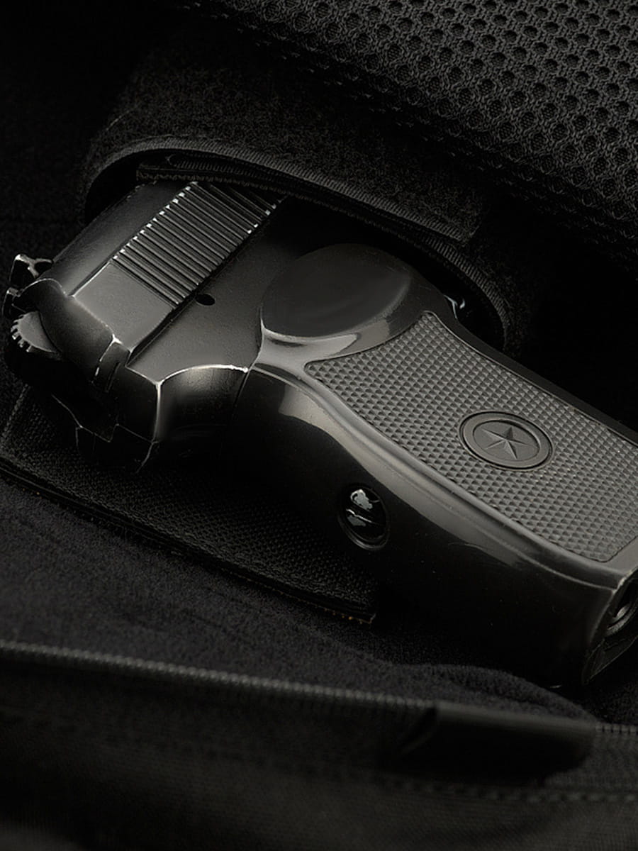 Model ten jest również przeznaczony do ukrytego przenoszenia broni. W środku saszetki znajduje się sztywna wkładka na rzep, która jest kompatybilna z uniwersalnymi kaburami i pozwala na szybkie wyciągnięcie lub ukrycie broni.