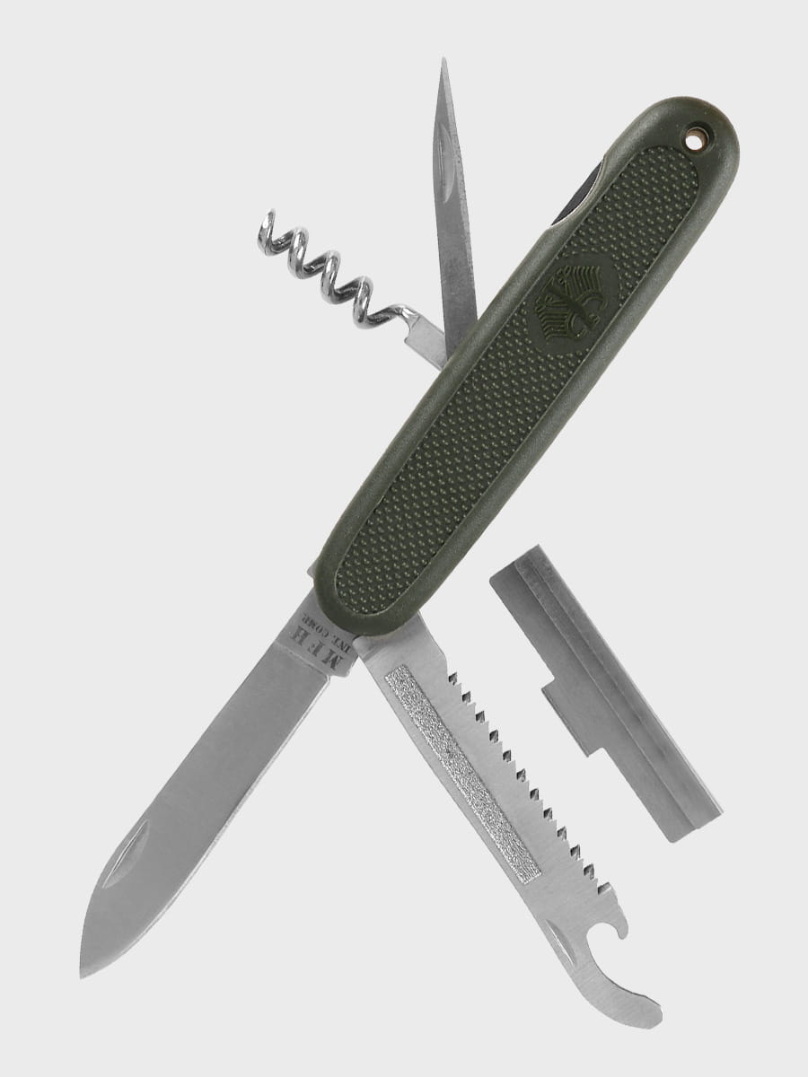 Piłę dwurzędową do drewna i tworzyw z ostrymi zębami umieszczonymi naprzemiennie, zakończoną otwieraczem do konserw i butelek. Posiada płaski śrubokręt oraz szydło.