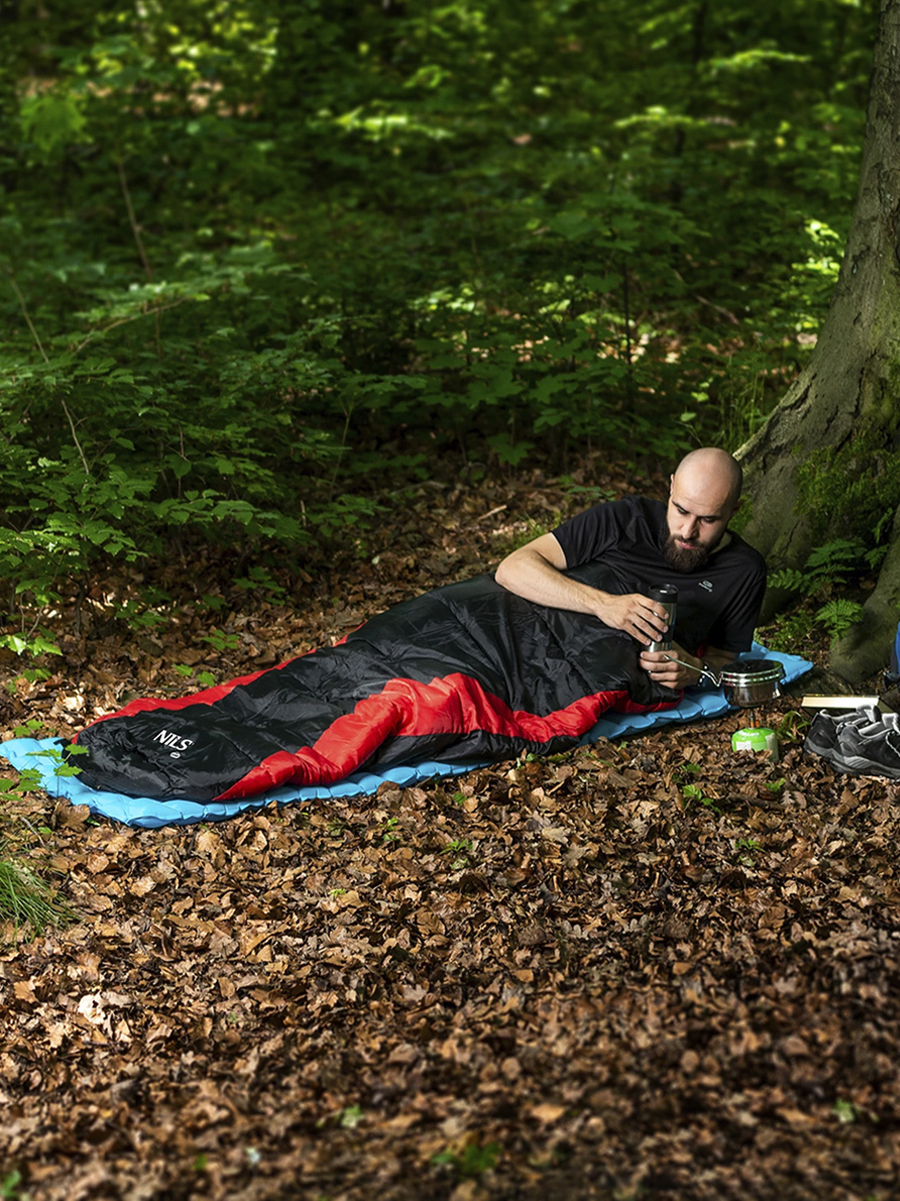 UWAGA! Przedmiotem oferty jest NILS CAMP ŚPIWÓR NC2012 CZARNO-CZERWONY. Pozostałe elementy służą przedstawieniu funkcjonalności.