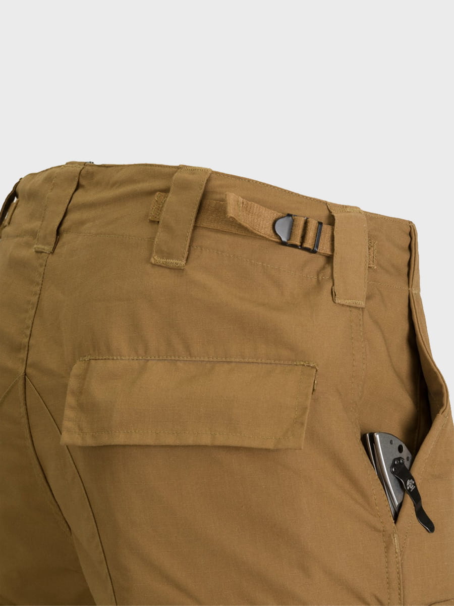 Kieszenie biodrowe mają wzmocnione krawędzie aby zagwarantować im maksymalną wytrzymałość na zużycie od klipsów noży. Te spodnie będą doskonałym wyborem nie tylko do użytku polowego, ale także jako część codziennego ubioru miejskiego.