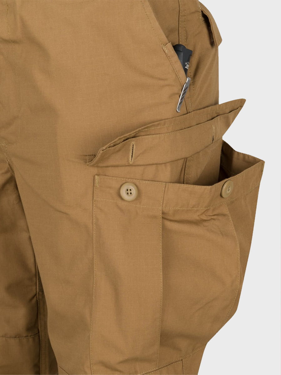 Kieszenie biodrowe mają wzmocnione krawędzie aby zagwarantować im maksymalną wytrzymałość na zużycie od klipsów noży. Te spodnie będą doskonałym wyborem nie tylko do użytku polowego, ale także jako część codziennego ubioru miejskiego.
