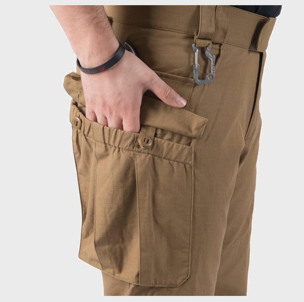 Na udach umieszczone zostały pojemne kieszenie cargo zapinane na guziki. Na łydkach znajdują się niewielkie kieszenie zapinane na rzepy mogące pomieścić opatrunek osobisty.