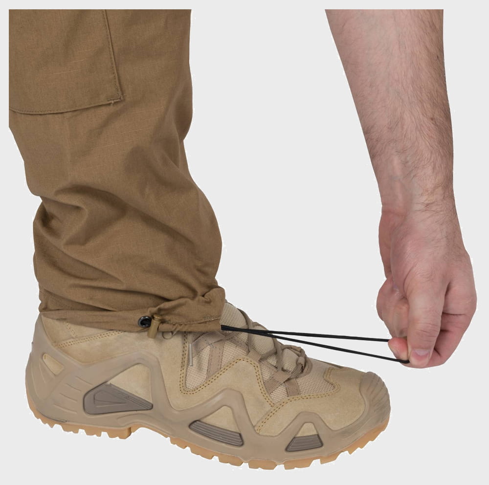 Na udach umieszczone zostały pojemne kieszenie cargo zapinane na guziki. Na łydkach znajdują się niewielkie kieszenie zapinane na rzepy mogące pomieścić opatrunek osobisty.