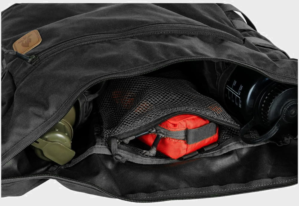 Dla zwiększenia funkcjonalności boki torby zostały obszyte taśmami MOLLE/PALS, przez co możemy przytroczyć do niej dodatkowe kieszenie. Pod taśmami znajdują się łącznie cztery płaskie kieszenie przeznaczone do przenoszenia noża, piły składanej lub siekiery.