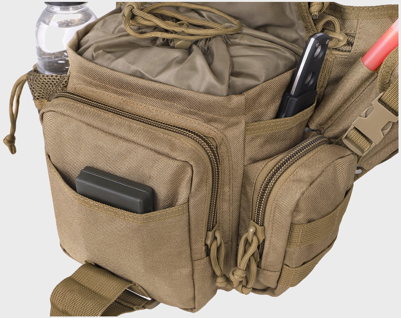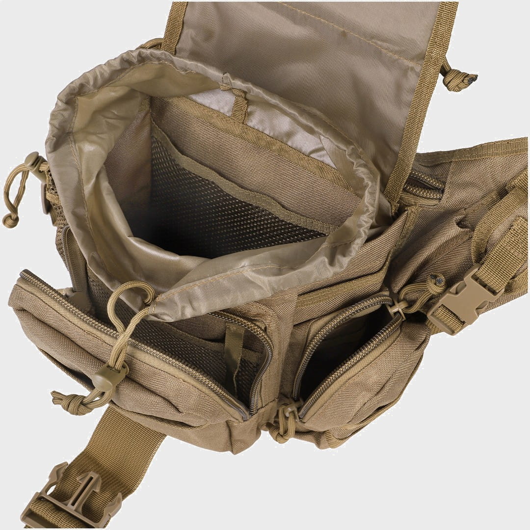 Torba wyposażona w taśmy w systemie Molle – umożliwiające podczepienie dodatkowej kieszeni, radia, ładownic lub telefonu.